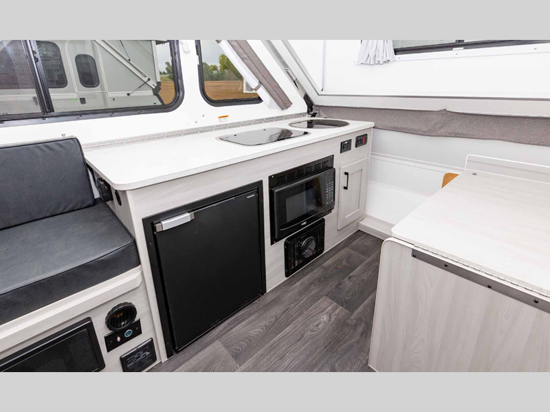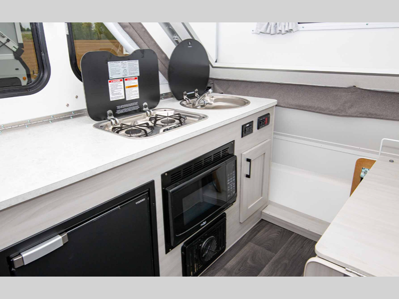 Sleeps 2 Length 15 ft Ext Width 6 ft 6 in Ext Height 5 ft 4 in Hitch Weight 180 lbs GVWR 3000 lbs Dry Weight 1930 lbs Fresh Water Capacity 11 gals Tire Size 14" Furnace BTU 18000 btu Refrigerator Type 12V Refrigerator Size 3.2 cu ft Cooktop Burners 2 Axle Count 1 Shower Type Wet/Bath Shower