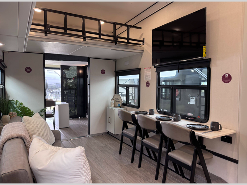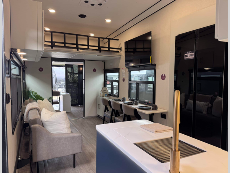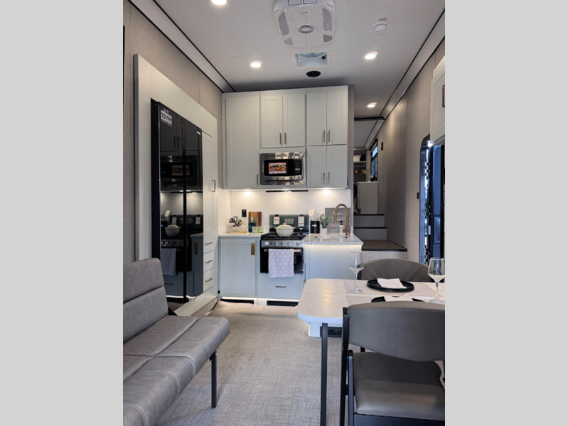 The LifeTrac Modular Component System and garage tie-downs will let you configure your space for furniture, toys, gear, and more! There is composite and commercial-grade vinyl flooring inside, along with aluminum cabinets and solid surface countertops, glass shower doors, and a residential bed for all-around comfort. The exterior is just as accommodating with its pass-through storage, power awning with LED lights, hydraulic leveling system, and a GenY Hitch to name a few conveniences.