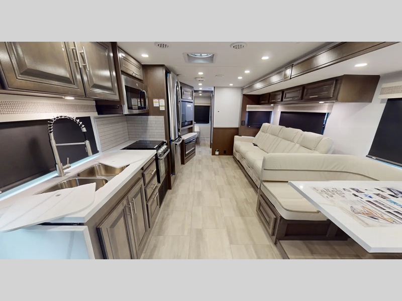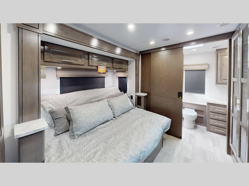 A MORryde 1.5 steel truss chassis up-fit holds them together and a hydraulic 4-point leveling system keeps them level wherever you go. If you desire to go off the grid, then you will appreciate the solar panel and 6,000-watt Yamaha generator. With a Sony 10" in-dash touchscreen radio you can play your favorite tunes, and the color side and rear cameras will make parking at the campsite easier than ever. There are also raised panel solid wood cabinet doors, spacious galleys, and plenty of storage space throughout for your belongings.