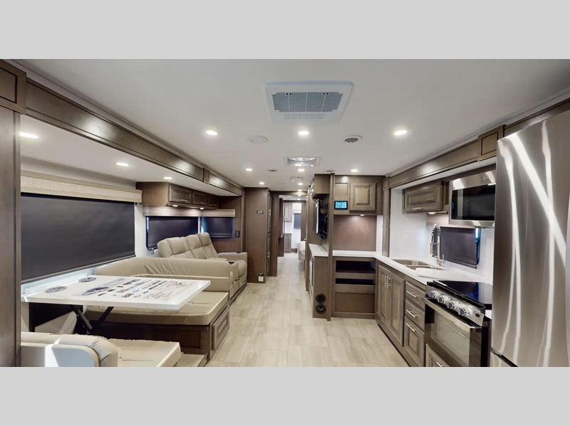 Sleeps 4 Slides 2 Length 34 ft 11 in Ext Width 8 ft 4 in Ext Height 12 ft 9 in Int Height 6 ft 10 in Exterior Color Carolina, Indigo, Poppy, Titanium Hitch Weight 5000 lbs GVWR 22000 lbs Fresh Water Capacity 80 gals Grey Water Capacity 42 gals Black Water Capacity 42 gals Furnace BTU 35000 btu Generator 6,000W Yamaha Fuel Type Gas Engine 7.3L V8 Chassis Ford F53 Horsepower 350 hp Fuel Capacity 80 gals Wheelbase 228 in Number Of Bunks 1 Available Beds King Torque 468 ft-lb Refrigerator Type Stainless Steel 3 Door Residential Refrigerator Size 18 cu ft Cooktop Burners 3 Number of Awnings 1 Axle Weight Front 8000 lbs Axle Weight Rear 15000 lbs LP Tank Capacity 24.5 Gal Water Heater Capacity 6 gal AC BTU 28500 btu TV Info LR 40" LED TV, BR 32" LED TV, Exterior 40" LED TV Awning Info 19' Encased Power with LED Lights Washer/Dryer Available Yes Gross Combined Weight 26000 lbs Shower Type Shower w/Seat Electrical Service 50 amp Similar Floorplans