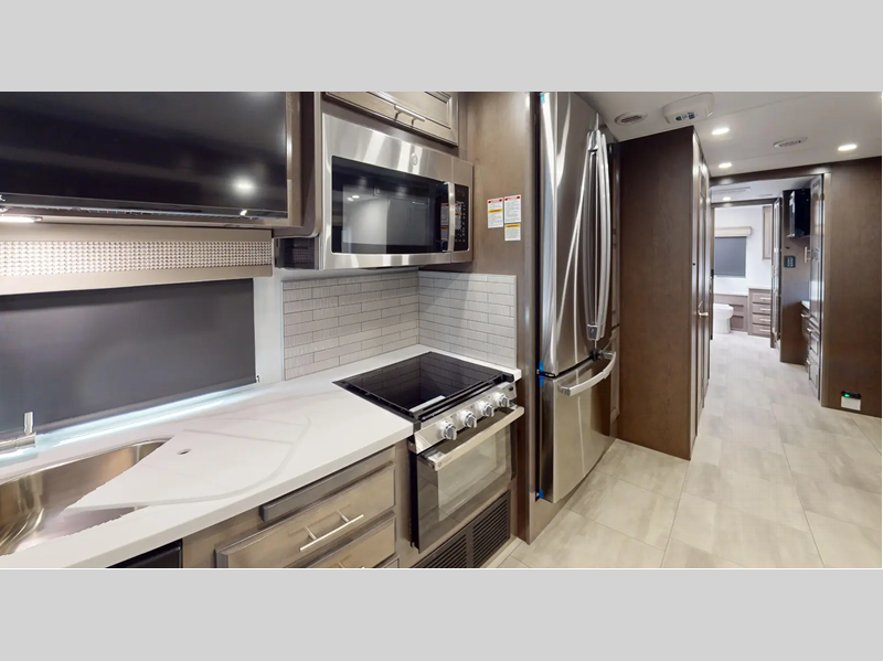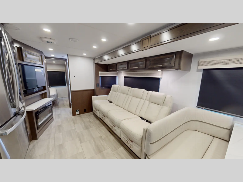 Sleeps 4 Slides 3 Length 37 ft 11 in Ext Width 8 ft 4 in Ext Height 12 ft 9 in Int Height 6 ft 10 in Exterior Color Carolina, Indigo, Poppy, Titanium Hitch Weight 5000 lbs GVWR 22000 lbs Fresh Water Capacity 80 gals Grey Water Capacity 52 gals Black Water Capacity 52 gals Furnace BTU 35000 btu Generator 6,000W Yamaha Fuel Type Gasoline Engine 7.3L V8 Chassis Ford F53 Horsepower 350 hp Fuel Capacity 80 gals Wheelbase 242 in Number Of Bunks 1 Available Beds King Torque 468 ft-lb Refrigerator Type Stainless Steel 3 Door Residential Refrigerator Size 18 cu ft Cooktop Burners 3 Number of Awnings 1 Axle Weight Front 8000 lbs Axle Weight Rear 15000 lbs LP Tank Capacity 24.5 Gal Water Heater Capacity 6 gal AC BTU 30000 btu TV Info LR 40" LED TV, BR 32" LED TV, Exterior 40" LED TV Awning Info 18' Encased Power with LED Lights Washer/Dryer Available Yes Gross Combined Weight 26000 lbs Shower Type Shower w/Seat Electrical Service 50 amp Similar Floorplans