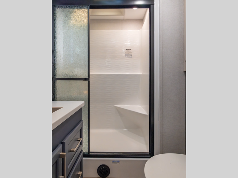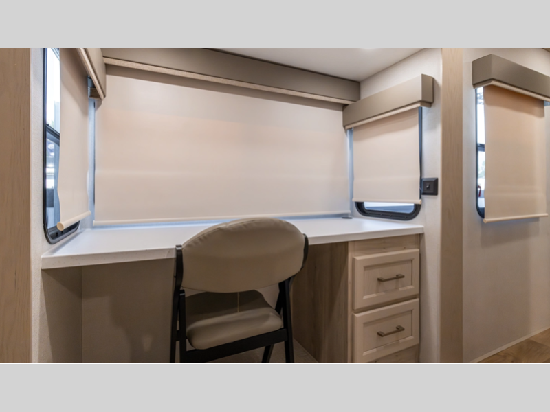There is a 6-point hydraulic leveling system that will have you set up at camp in no-time, and the slam latches on all storage doors will make it easy to unload your gear. A heated utility convenience center is also found outside, along with a tire pressure monitoring system, a ladder, and slide toppers. Inside, you'll be met with upgraded true solid surface countertops in the bath and kitchen, dimmable ceiling strip lighting, hybrid marine-grade carpet, plus roller day/night shades in the main areas to name a few comforts.