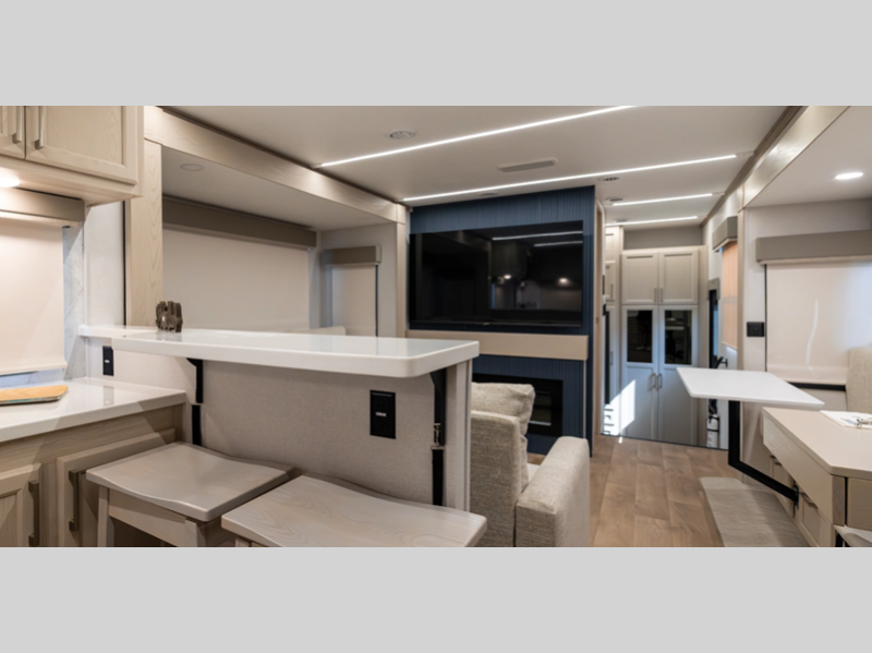 Sleeps 4 Slides 4 Length 42 ft 4 in Ext Width 8 ft 5 in Ext Height 13 ft 6 in Int Height 7 ft Exterior Color Full Body Paint Pearl White and Black (required with paint option) Hitch Weight 2425 lbs GVWR 17999 lbs Dry Weight 14844 lbs Cargo Capacity 3155 lbs Fresh Water Capacity 75 gals Grey Water Capacity 78 gals Black Water Capacity 39 gals Tire Size 16" Furnace BTU 35000 btu Available Beds King Refrigerator Type Stainless Steel 12V Refrigerator Size 18 cu ft Cooktop Burners 4 Shower Size 48" x 30" Number of Awnings 2 Axle Weight 8000 lbs LP Tank Capacity 30 lbs Water Heater Capacity 12 gal AC BTU 45000 btu TV Info LR 50" Smart TV, BR Smart TV Awning Info 15' and 19' Power w/LED Lighting Axle Count 2 Washer/Dryer Available Yes Number of LP Tanks 2 Shower Type Standard Solar Wattage 260 watts Similar Floorplans
