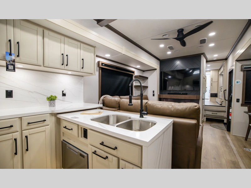 The Forest River RiverStone fifth wheels and toy haulers are super luxurious and convenient for all your camping or full-time needs! These elegant units have standard features that will enhance every aspect of your trip, like a cordless vacuum, 18-cubic foot French door refrigerator with an ice maker, an under-bed storage compartment, and hydraulic slide outs.