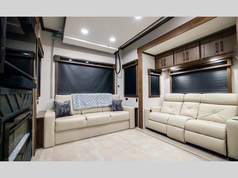 Sleeps 4 Slides 5 Length 44 ft 7 in Ext Width 8 ft 6 in Ext Height 13 ft 4 in Hitch Weight 3950 lbs GVWR 24000 lbs Dry Weight 17726 lbs Cargo Capacity 6274 lbs Fresh Water Capacity 95 gals Grey Water Capacity 82 gals Black Water Capacity 41 gals Tire Size 17.5" Furnace BTU 40000 btu Available Beds Super Queen Refrigerator Type French Door with Ice Maker Refrigerator Size 18 cu ft Convection Cooking Yes Cooktop Burners 4 Number of Awnings 2 Axle Weight 7000 lbs LP Tank Capacity 40 lbs Water Heater Type Truma Aqua Go Comfort On Demand AC BTU 30000 btu TV Info LR 65" Samsung LED Smart TV, BR 40" Smart LED TV, Ext. TV Awning Info 11' 6" and 18' Electric with LED Lights Axle Count 3 Washer/Dryer Available Yes Number of LP Tanks 2 Shower Type Standard Electrical Service 50 amp Solar Wattage 200 watts Similar Floorplans