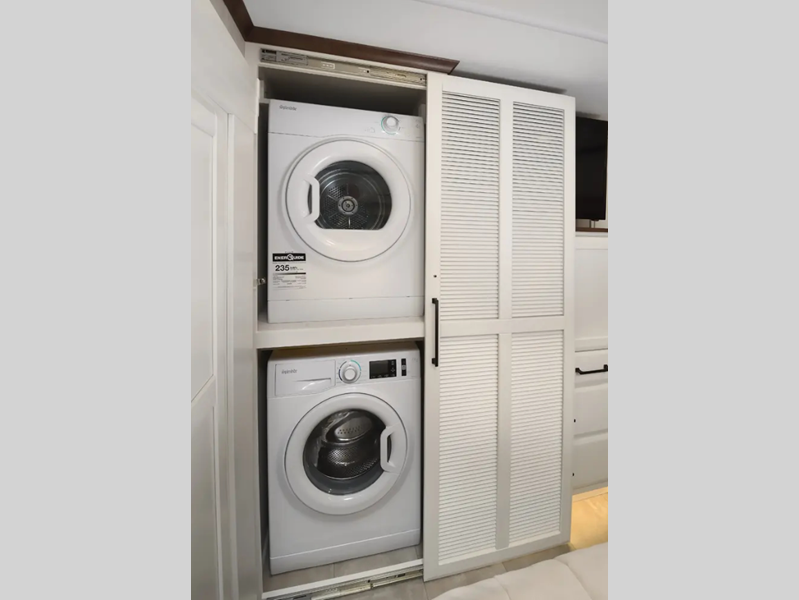 You will truly appreciate the stackable washer/dryer because it will allow you to travel without restraint, and the Truma Aqua Go Comfort on-demand hot water heater will give you hot water whenever you need it. You'll stay entertained with a Samsung LED Smart TV in the living room and a 40" LED TV in the bedroom, and the 200W solar panel will provide some off-grid capabilities.