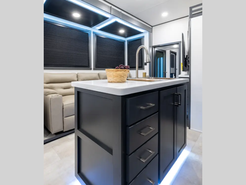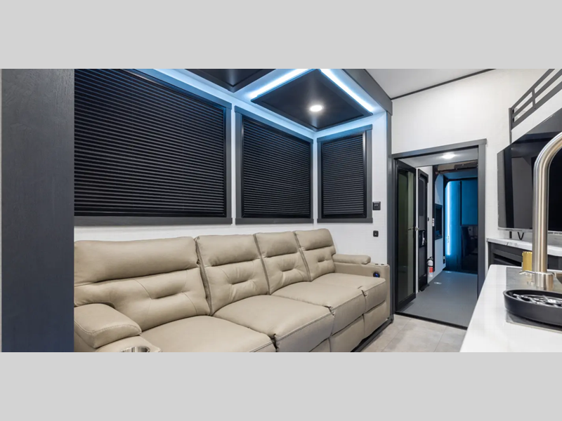 Sleeps 8 Slides 3 Length 45 ft 11 in Ext Width 8 ft 6 in Ext Height 13 ft 5 in Hitch Weight 3360 lbs GVWR 21000 lbs Dry Weight 15749 lbs Cargo Capacity 5251 lbs Fresh Water Capacity 150 gals Grey Water Capacity 120 gals Black Water Capacity 32 gals Tire Size 16" Furnace BTU 35000 btu Generator 6.0 NPS Fuel Capacity 40 gals Number Of Bunks 1 Available Beds King Refrigerator Type 12V Residential Style Refrigerator Size 16 cu ft Shower Size 24" x 48" Number of Awnings 3 Garage Size 14 ft LP Tank Capacity 30 lbs Water Heater Type Tankless AC BTU 54000 btu TV Info LR Large TV Awning Info 11', 12', 12' Electric w/LED Lights Axle Count 2 Washer/Dryer Available Yes Number of LP Tanks 2 Shower Type Standard Electrical Service 50 amp Solar Wattage 200 watts Similar Floorplans