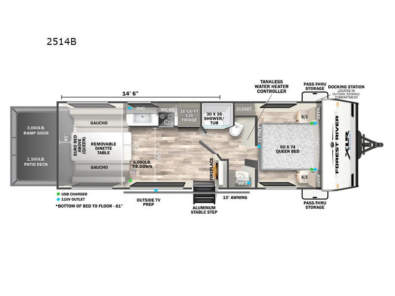 There is a rear beaver tail frame, a docking station, and a magnetic screen wall so you can let the fresh air in without letting the bugs in. You will feel right at home with decorative kitchen backsplash and LED lights, and there is a tankless water heater to provide endless hot showers after trail riding. The Alumifoil insulated enclosed underbelly will help extend your camping season, and the patio railing kit will let you enjoy more time outdoors once the toys are unloaded.