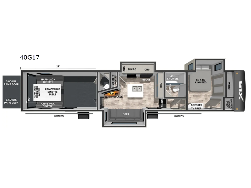 These toy haulers are 3/4 ton or 1 ton towable, and the additional height and width provides extra room for your toys to come along too. The MORryde CRE3000 suspension enhancement makes towing smooth and the Ground Control 3.0 auto electric leveling will have you set up at camp in no-time. The contemporary interior design will make your space feel a little more like home and the Congoleum stain-resistant vinyl flooring is perfect for a toy hauler with dirt, gas, and oil being brought in.