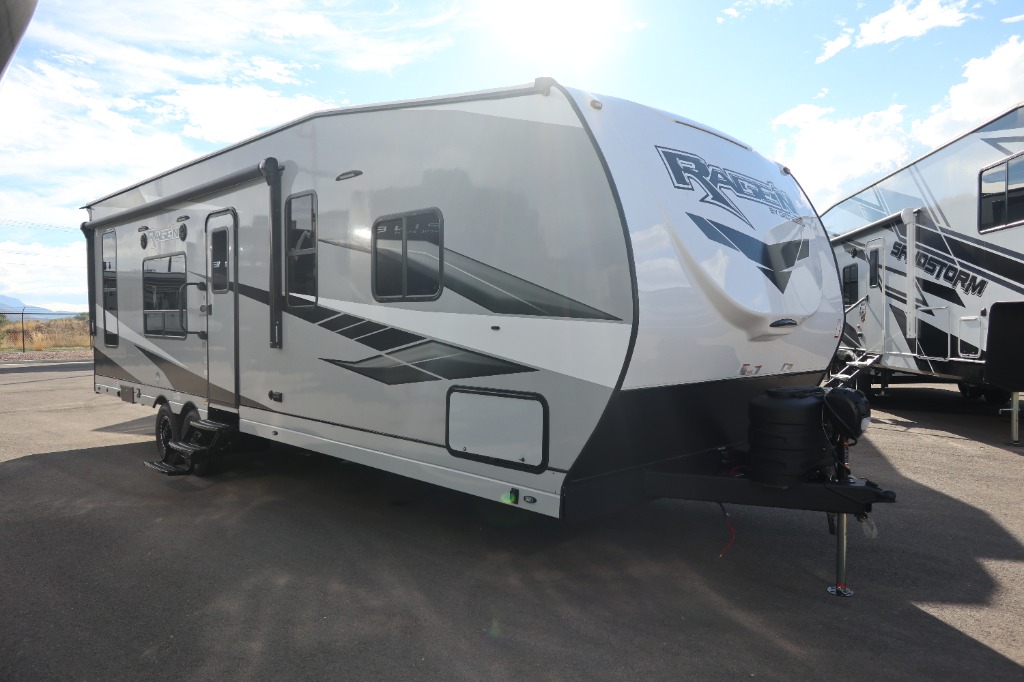 Looking for plenty of cargo space for your toys, a private bedroom for yourself with a walk-around bed, and a spacious full bath? You have found it with this toy hauler! You will also find lots of storage in the bedroom wardrobes, the overhead cabinets and along the exterior to carry all of your clothing, food and gear. The L-shaped kitchen offers full amenities including a 10 cu. ft. 12V refrigerator and microwave to keep everyone fed. You can dine inside at the booth dinette or on the sofa, or head outdoors to relax under the power awning. This model also includes two powered rear queen beds for guests to sleep on! The Rage'n fifth wheel and travel trailer toy haulers by Genesis Supreme are the perfect match for outdoor enthusiasts. The innovative floorplans include many at-home features and conveniences to make each trip enjoyable. Loading up your toys will be easier than ever since there is a 102" wide-body design, and the durable construction means you can enjoy your toy hauler for years to come. There are many different features available, depending on the model you choose, plus available options to further customize your unit. Choose a Rage'n toy hauler today! We have 1 R2715FSXL availableView InventorySpecificationsSleeps 8 Length 32 ft 9 in Ext Width 8 ft 6 in Hitch Weight 1320 lbs GVWR 11500 lbs Dry Weight 7460 lbs Cargo Capacity 4040 lbs Fresh Water Capacity 100 gals Grey Water Capacity 40 gals Black Water Capacity 40 gals Tire Size 15" Furnace BTU 30000 btu Fuel Capacity 40 gals Number Of Bunks 2 Available Beds Queen Refrigerator Type 12V Refrigerator Size 10 cu ft Cooktop Burners 3 Number of Awnings 1 Axle Weight 6140 lbs LP Tank Capacity 20 lbs Water Heater Capacity 6 gal Water Heater Type Gas DSI AC BTU 15000 btu TV Info LR 32" TV Awning Info Power Axle Count 2 Number of LP Tanks 2 Shower Type Radius Similar Toy Hauler Travel Trailer Floorplans