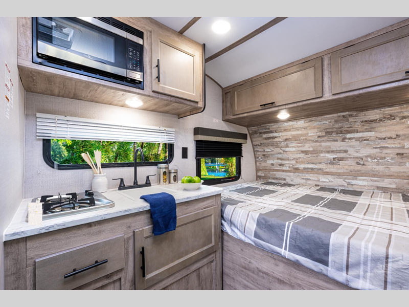 Sleeps 2 Length 18 ft 2 in Ext Width 6 ft 9 in Ext Height 9 ft 2 in Int Height 6 ft Hitch Weight 360 lbs Dry Weight 2410 lbs Cargo Capacity 1450 lbs Fresh Water Capacity 18 gals Grey Water Capacity 27 gals Black Water Capacity 27 gals Furnace BTU 20000 btu Available Beds Queen RV Refrigerator Type Gas/Electric Cooktop Burners 2 LP Tank Capacity 20 lbs Water Heater Capacity 6 gal Water Heater Type DSI Gas AC BTU 5000 btu Axle Count 1 Number of LP Tanks 1 Shower Type Wet/Bath Shower Solar Wattage 100 watts