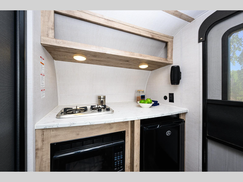 Sleeps 2 Length 11 ft 10 in Ext Width 5 ft 5 in Ext Height 8 ft 2 in Int Height 4 ft 6 in Hitch Weight 240 lbs Dry Weight 1510 lbs Cargo Capacity 2250 lbs Fresh Water Capacity 9 gals Furnace BTU 19000 btu Refrigerator Type Gas/Electric Cooktop Burners 2 LP Tank Capacity 20 lbs Water Heater Capacity 6 gal Water Heater Type DSI Gas AC BTU 5000 btu Axle Count 1 Number of LP Tanks 1 Solar Wattage 100 watts Similar Floorplans