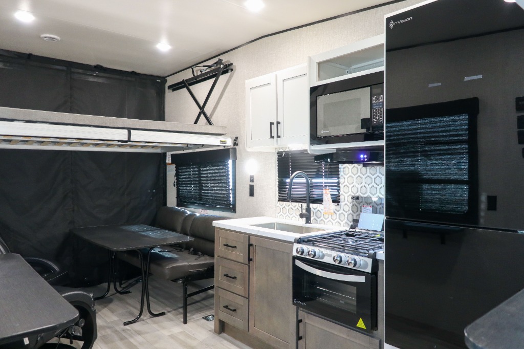 You will have everything you need for a comfortable camping trip in this toy hauler! Unload your off-road toy easily from the cargo area featuring up to 14' of space using the spring assist 8' ramp door for a fun day out on the trails. The fully equipped kitchen has a three burner cooktop to fry up some eggs in the morning, and you can enjoy them at either the flip-up bar top with two stools or at the rear convertible sofa and two chairs in the other side if the removable table. The dual entry bathroom is easy to access from the front private bedroom and it has a radius shower to wash the mud out of your hair.