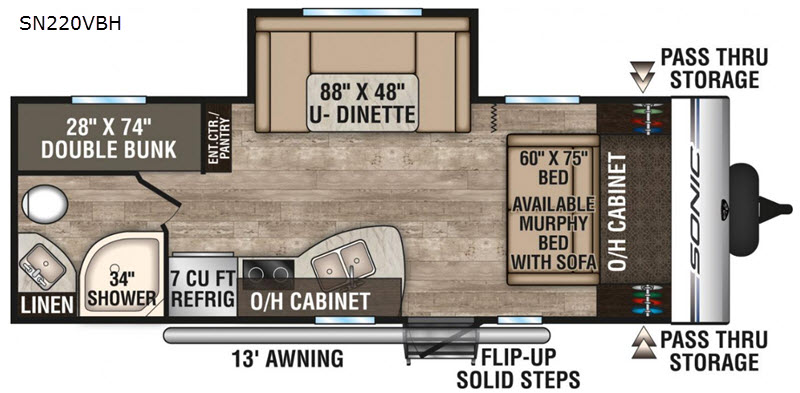 With any Sonic travel trailer by Venture RV, you begin with Next Generation in RV frame technology with the NXG Huck-bolt frame, AZDEL Onboard composite panels, tongue and groove plywood floor decking, radiant foil bubble insulation-wrapped tanks, 360-degree residential fiberglass insulation and radiant foil insulation, plus a forced-air heated and enclosed underbelly which is part of the Weather-Shield package. There is a Highway Package that comes mandatory, and the Fall Package 1.6 provides a motion light in the bathroom, a dish drying sink cover, a power tongue jack, and WIFI prep to mention a few features. Get ready for comfort and style in a Sonic ultra-lightweight, tandem-axle travel trailer of your choice!