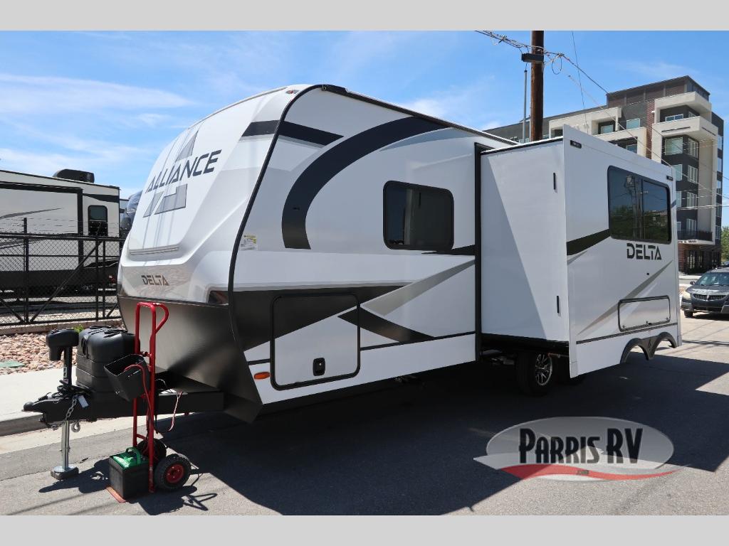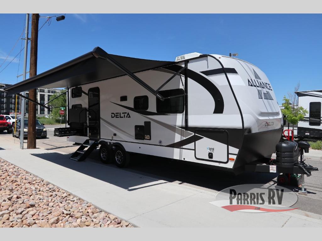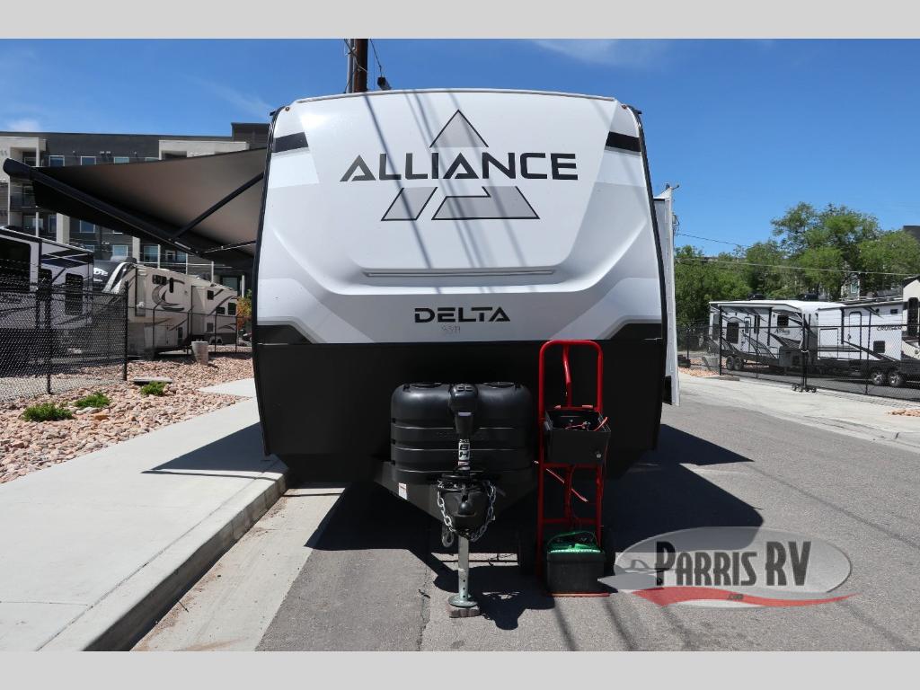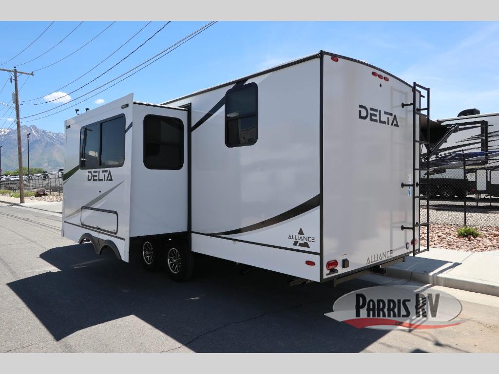 Sleeping for eight is easy in this new Delta travel trailer with a set of 46" x 75" rear corner bunks, a queen bed in the front private bedroom, and also using the u-shaped dinette once converted. The front bedroom features plenty of storage with large overhead cabinets as well as within bedside wardrobes and nightstands for your personal items. You can easily prepare all of your favorite meals and snacks with the kitchen amenities provided. A three burner range allows you to easy cook indoors, or you can enjoy cooking outside using the outdoor griddle/grill if you like. There is a 10 cu. ft. refrigerator to keep all of your perishables and drinks nice and cold, plus a large sink for dishes and cleaning up, as well as a pull-out trash can and flip-up counter extension. You will also appreciate the rear corner bath featuring a 30" x 36" shower, toilet, vanity with sink, and linen cabinet for your towels.