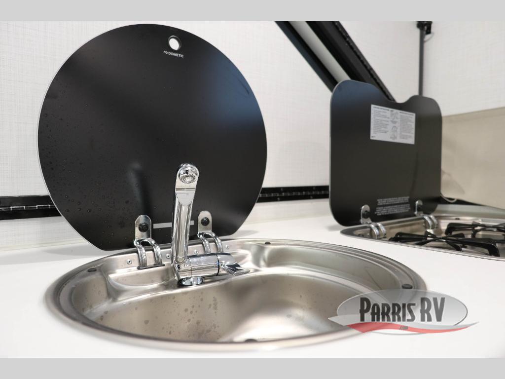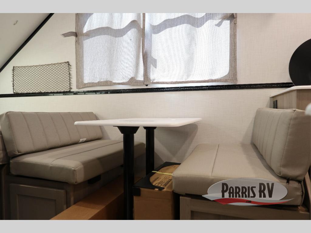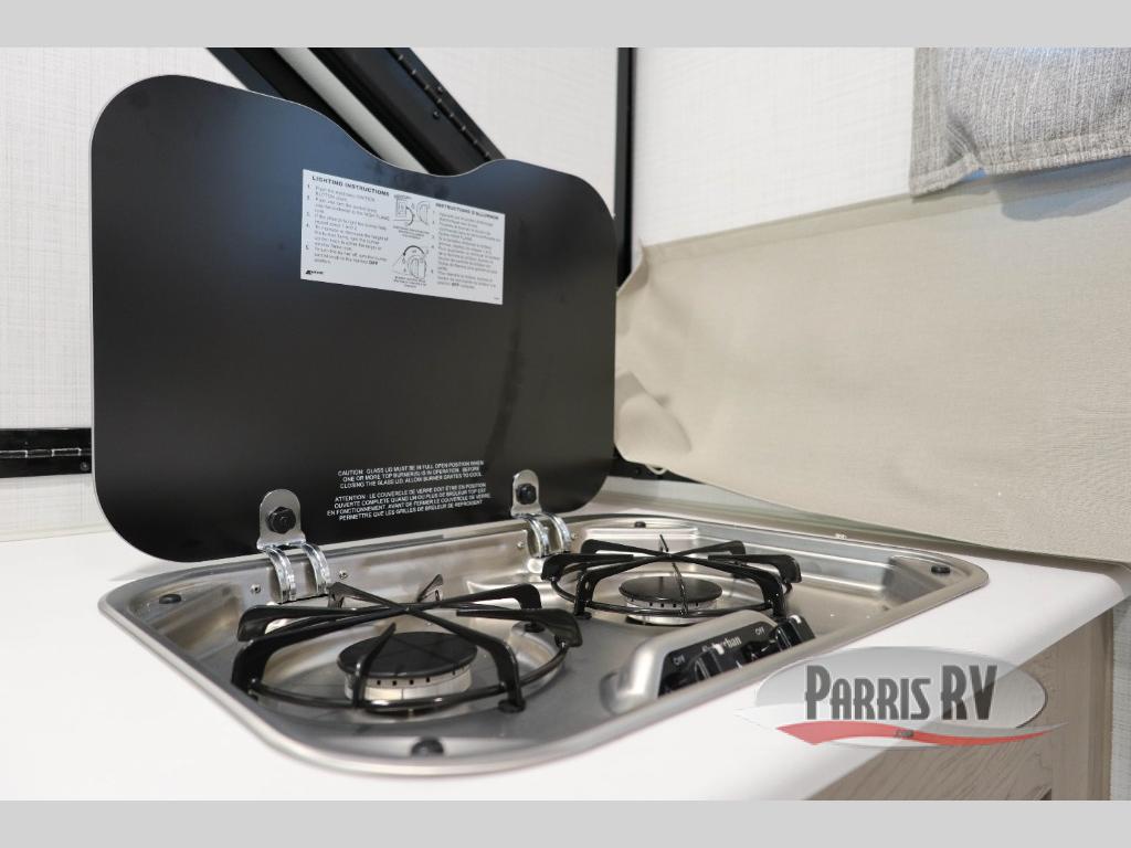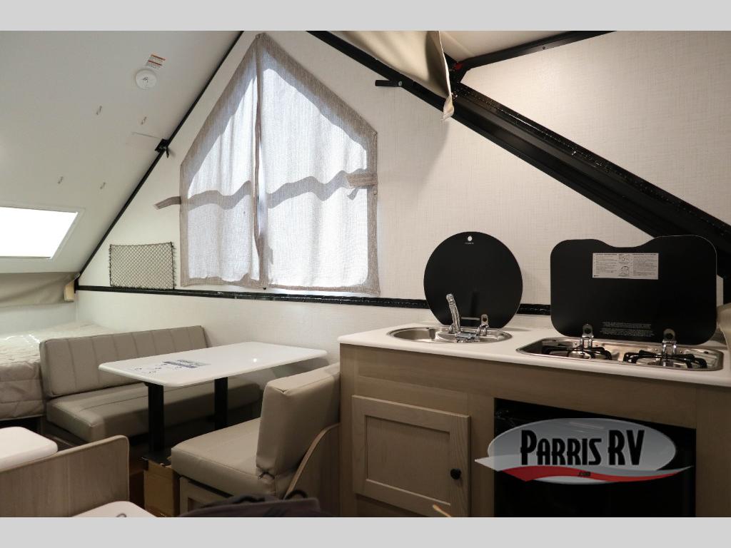 Camping trips in this A-frame camper are sure to bring memories! There is a rear flip-up 60" x 80" queen bed to sleep on, a 33" x 64" dinette to dine at and also let a guest stay over, plus a convenient wet bath so you can freshen up each day. The cooktop and microwave will let you make meals each day and the single bowl sink make clean up a breeze. There is also an exterior griddle if you enjoy cooking outside!