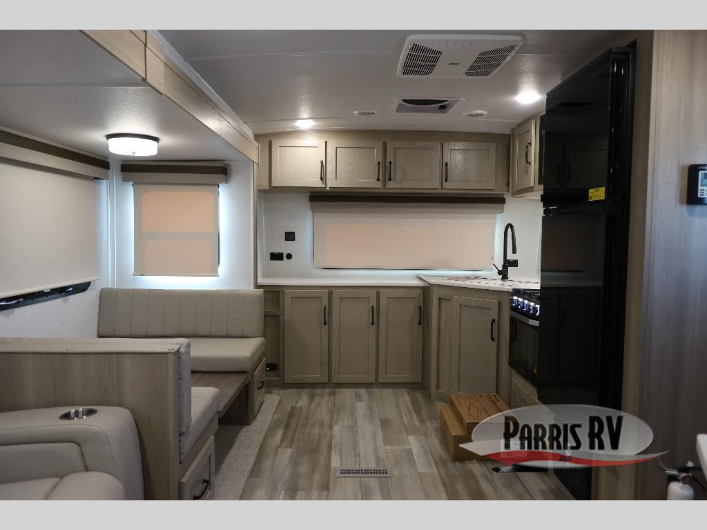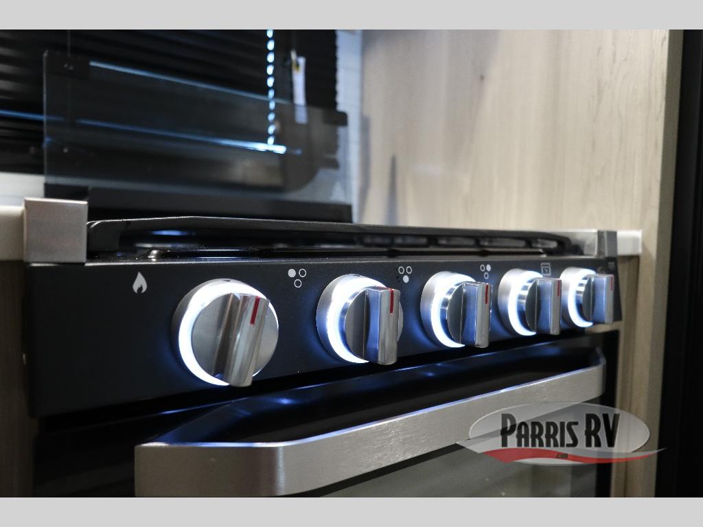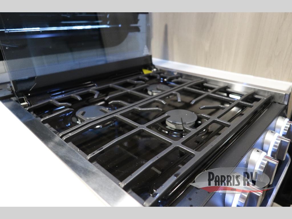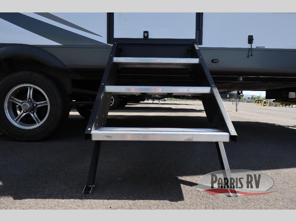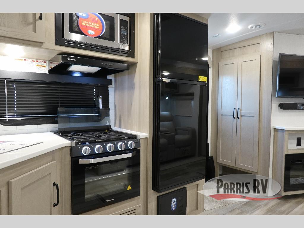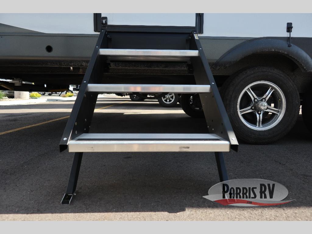 When you are outside this trailer you can enjoy the protection from the 21' power awning, and whip up a meal using the outside griddle. You will find exterior storage for your extra gear, and a ladder at the rear. You get to choose which entrance to step up into, be it the spacious rear bedroom with a queen bed slide and a wardrobe, or the main entry into the kitchen and living area. The furniture slide includes a booth dinette to eat your meals at, and theater seating to watch the Smart TV with a fireplace below. And the cook will love the front kitchen with extra counter space, a three burner range, plus a 12V refrigerator and pantry for food storage!