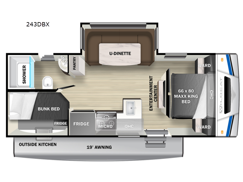 With any Wildcat fifth wheel or travel trailer by Forest River you will appreciate durable construction, including a Maxx strong laminated aluminum floor on the travel trailers, and underbelly armor on the fifth wheels. The Maxx insulation package includes high-density block foam insulation, two 30 lb. LP tanks, and a 35,000 BTU furnace to keep you comfortable year around. Some of the interior comforts you are sure to appreciate are the bedroom reading lights on both sides of the bed, the foot pedal flush toilet in the bath, the Rose Gold door and drawer hardware, and more!