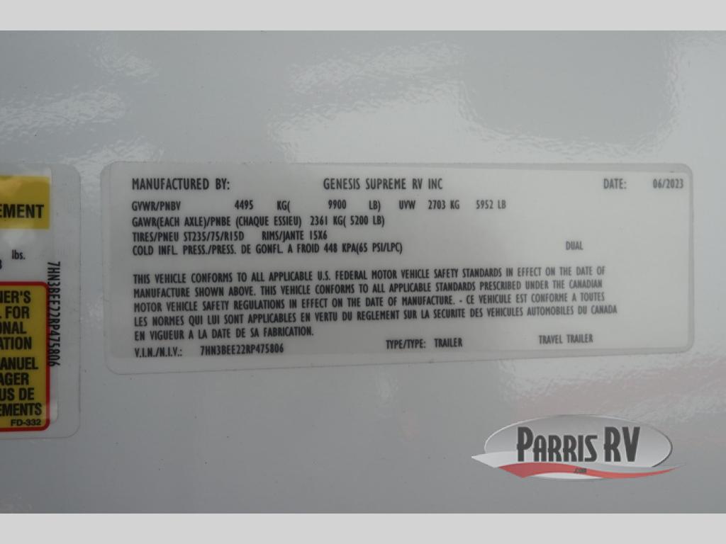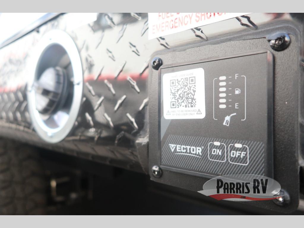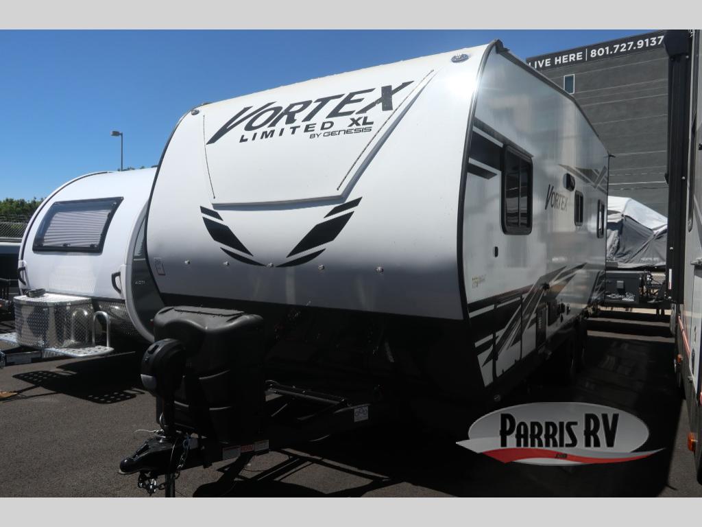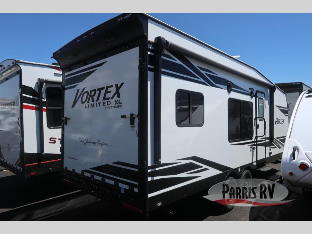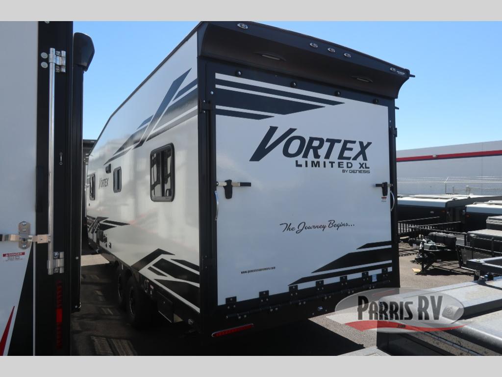 Your camping life is going to be a blast with the Genesis Supreme Vortex toy hauler! These work horses get the job done but also make it fun. They are built with white fiberglass laminated aluminum-framed sidewalls and a 8" I beam frame so you can be sure they will hold up. The manual awning with LED lights will give you protection as you use the exterior features. The 15" blacked out wheels will get you to and from your destination with confidence, and the furnace will ensure that you don't freeze while you sleep on cool nights. You can keep power flowing with the optional 4.0kW generator with transfer switch, and you'll also enjoy the function and the style of the solid-surface countertops in the kitchen.