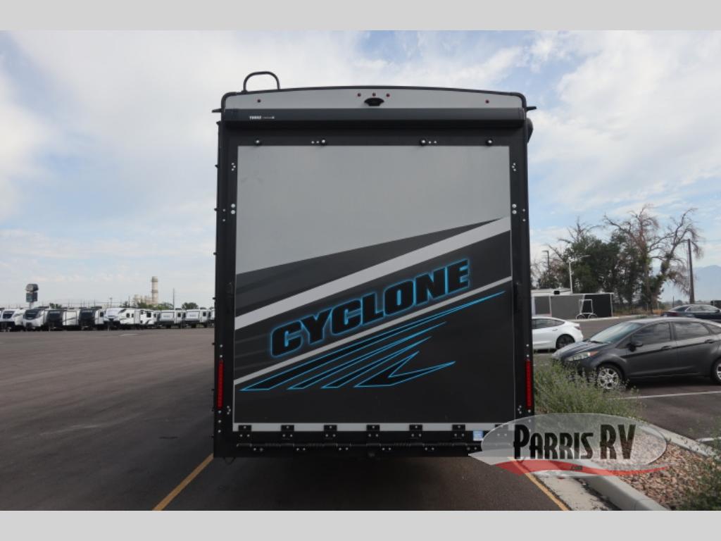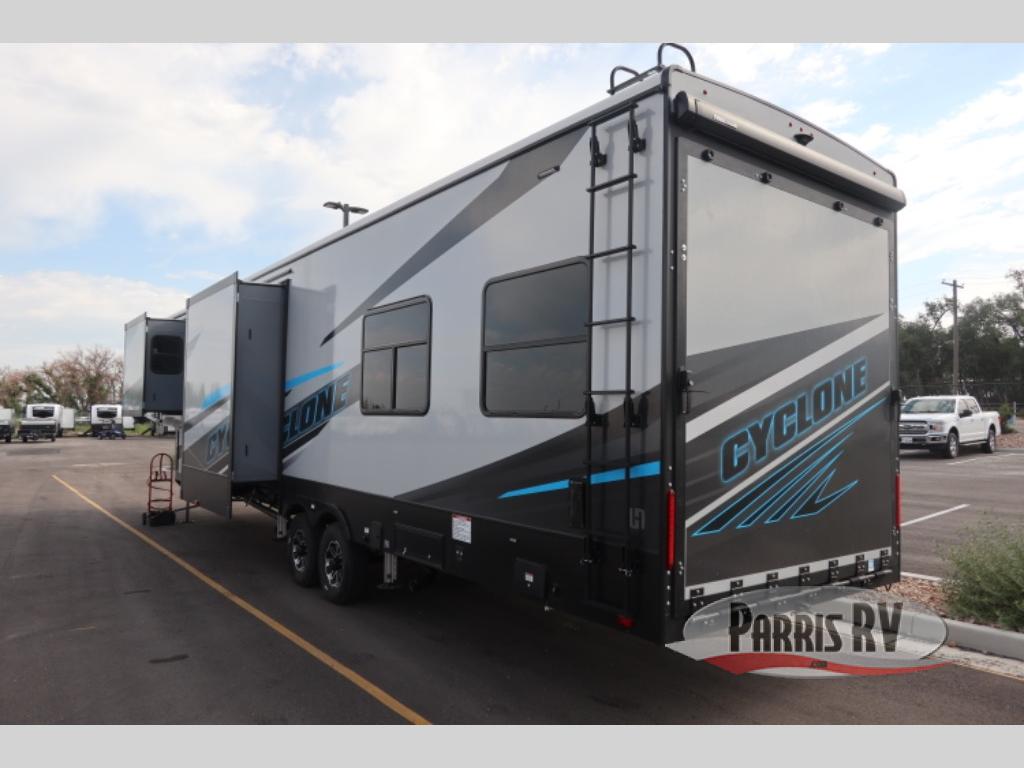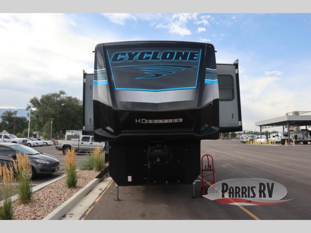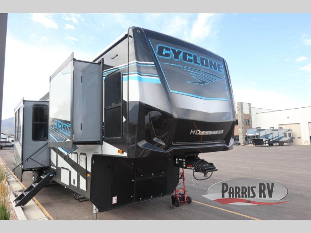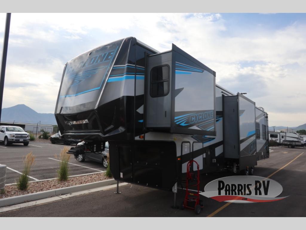 Satisfy your wanderlust with a Heartland Cyclone fifth wheel toy hauler! You won't have to sacrifice any luxury either with indulgent features like the king bedroom suite with a "swift space" work station that pulls out from the dresser, a Stor-Mor three-sided access to the basement with 30% more storage capacity, and Step Caddy folding patio step for better stability as you enter or exit the patio. The industry first Grill and Go 25" residential pull out 3 burner griddle combo comes on models with an exterior kitchen for an easier cooking experience. Full height shaker cabinetry provides 25% more storage space so you can bring more camping necessities with you. If you like to dry camp longer then you will appreciate the industry's largest 150 gallons fresh water tanks. Come find the perfect model for you today!