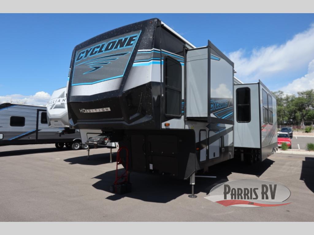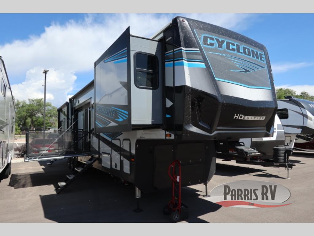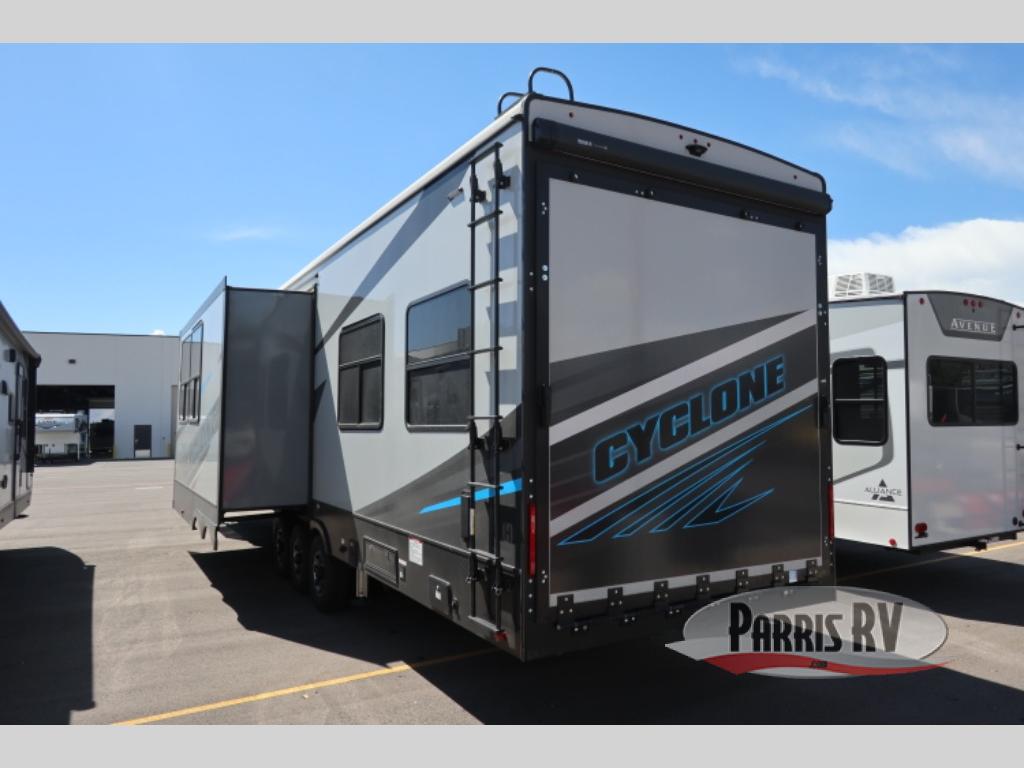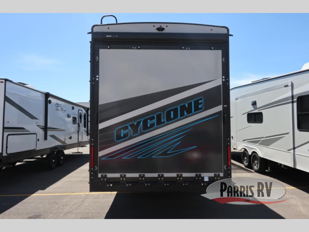 Satisfy your wanderlust with a Heartland Cyclone fifth wheel toy hauler! You won't have to sacrifice any luxury either with indulgent features like the king bedroom suite with an exclusive East to West bed tilt system with 30% more floor space, Stor-Mor three-sided access to the basement with 30% more storage capacity, and Step Caddy folding patio step for better stability as you enter or exit the patio. The industry first Grill and Go 25" residential pull out 3 burner griddle combo comes on models with an exterior kitchen for an easier cooking experience. Full height shaker cabinetry provides 25% more storage space so you can bring more camping necessities with you. If you like to dry camp longer then you will appreciate the industry's largest 150 gallons fresh water tanks. Come find the perfect model for you today!