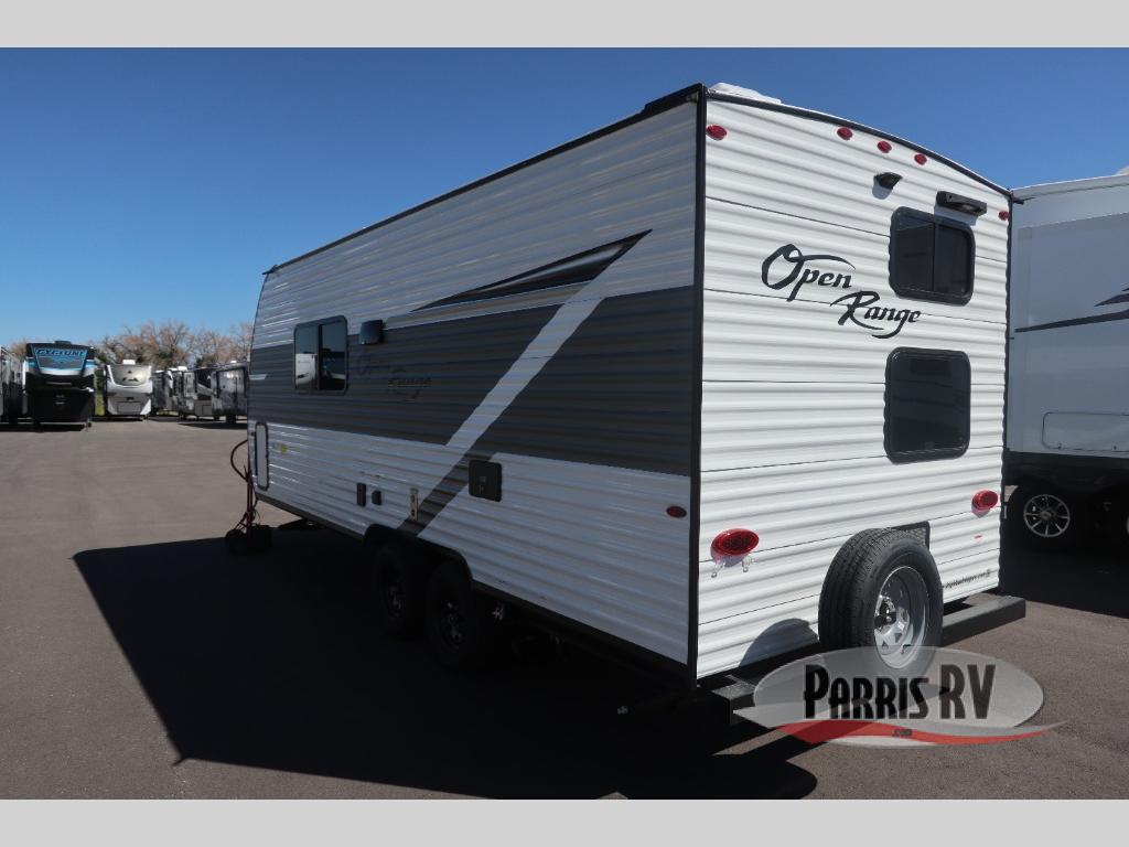 The affordable Open Range Conventional travel trailers by Highland Ridge are ready to meet your camping needs! You will appreciate the durable Magnum Roof system, plus each model is constructed with black front diamond plate protection, 5/8" main floor decking, and self-adjusting electric brakes with E-Z Lube axles for smooth towing. The 81" interior height means you won't feel cramped when relaxing with friends and family, and the residential vinyl flooring throughout is easy to clean, which will be perfect if you're camping with little ones or pets. These models also include an AM/FM/Bluetooth radio with indoor/outdoor speakers, a digital TV antenna that will go perfectly with the optional Smart TV, plus a 13,500 BTU roof mounted A/C to keep you cool on those hot summer months.