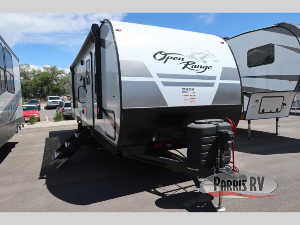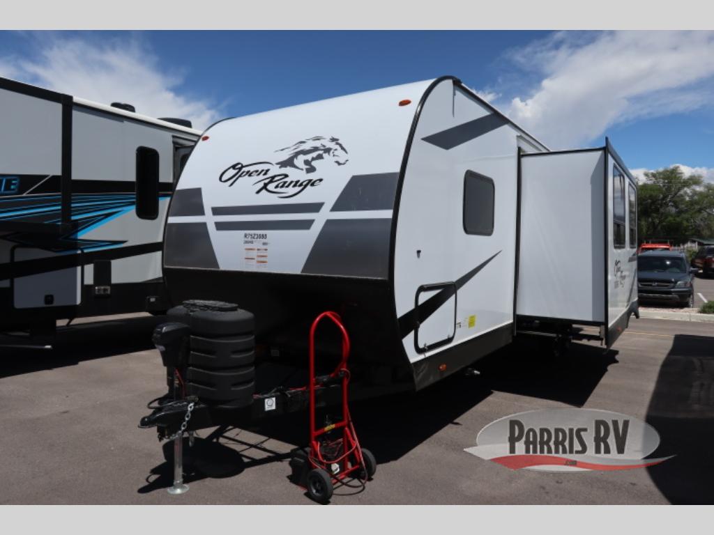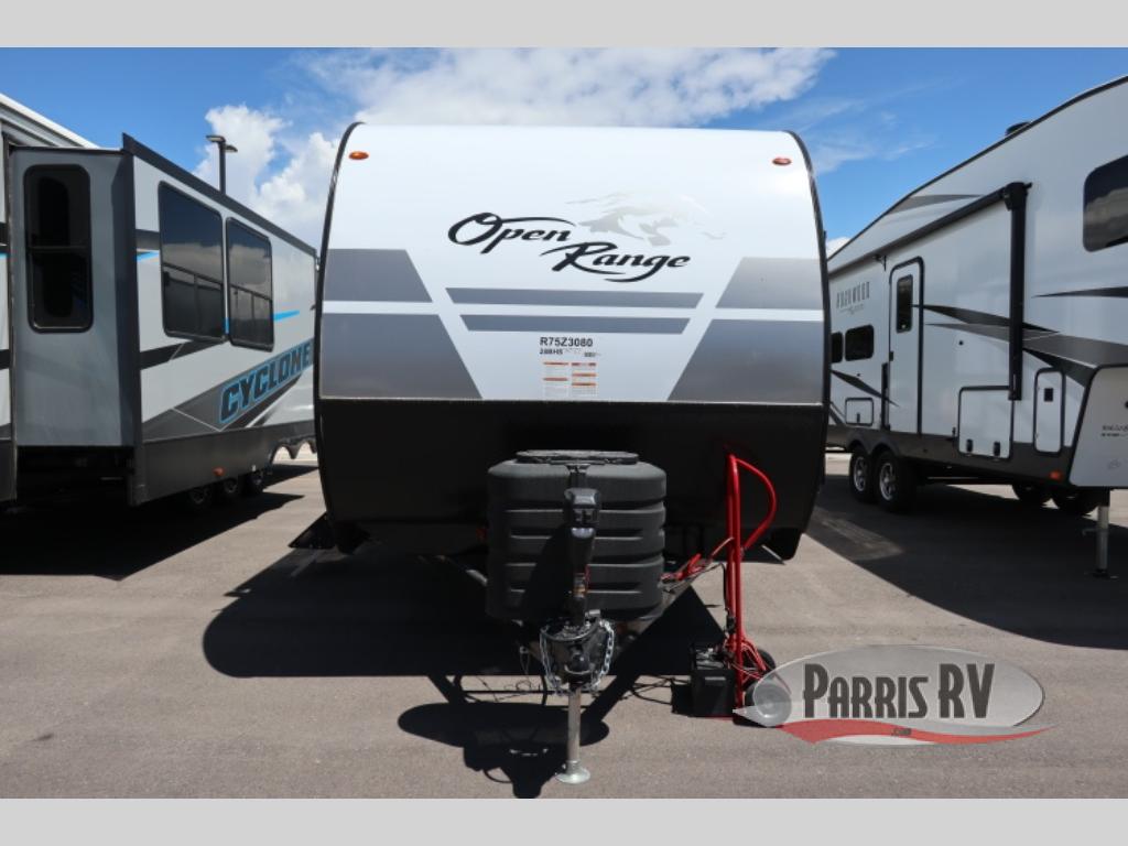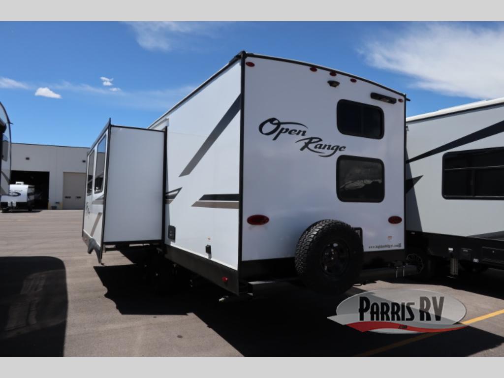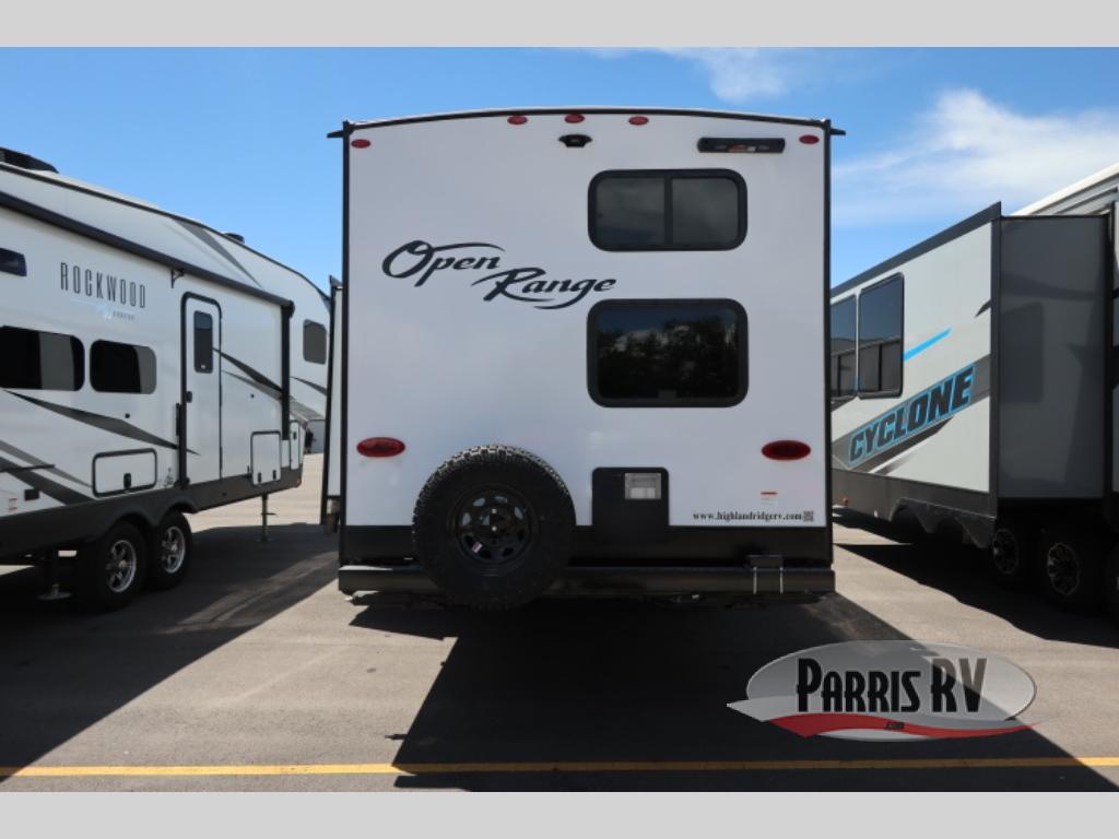 The affordable Open Range Conventional travel trailers by Highland Ridge are ready to meet your camping needs! You will appreciate the durable Magnum Roof system, plus each model is constructed with black front diamond plate protection, 5/8" main floor decking, and self-adjusting electric brakes with E-Z Lube axles for smooth towing. The 81" interior height means you won't feel cramped when relaxing with friends and family, and the residential vinyl flooring throughout is easy to clean, which will be perfect if you're camping with little ones or pets. These models also include an AM/FM/Bluetooth radio with indoor/outdoor speakers, a digital TV antenna that will go perfectly with the optional Smart TV, plus a 13,500 BTU roof mounted A/C to keep you cool on those hot summer months.