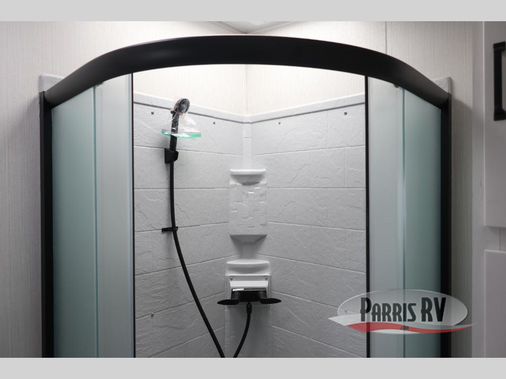 If space for toys is what you want, space is what you'll get in this toy hauler! There is a 6' 3" garage with 15' 10" total garage space when you use the tie-downs in the kitchen. Your crew can get comfortable on the rollover sleeper sofas or on the dual lounge chairs. The full bath with a 34" x 34" radius shower will let everyone stay clean, and the front private bedroom will feel just like home with its RV queen bed and dual shirt closets. If you need additional sleeping space for guests, you can add the optional queen bed electric lift in the garage!