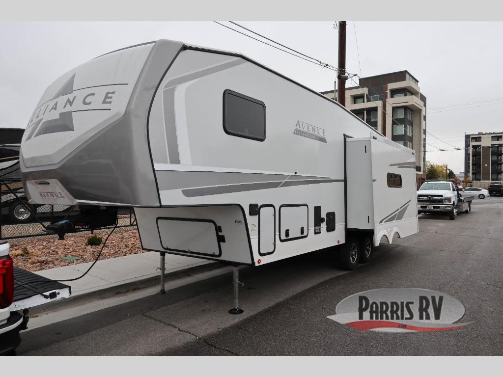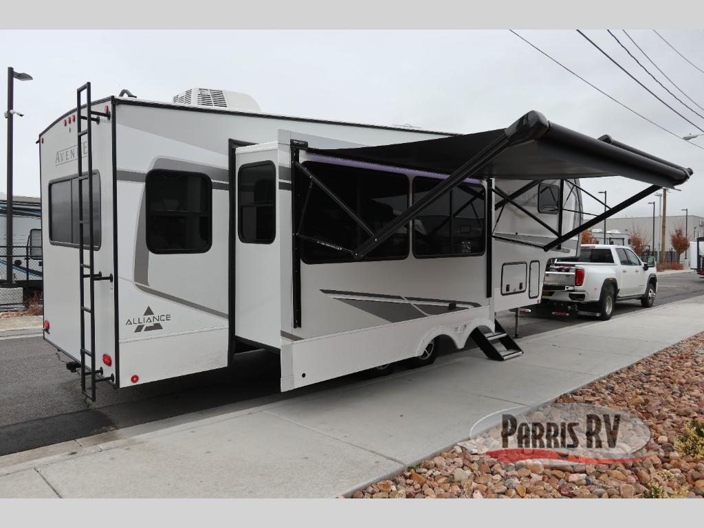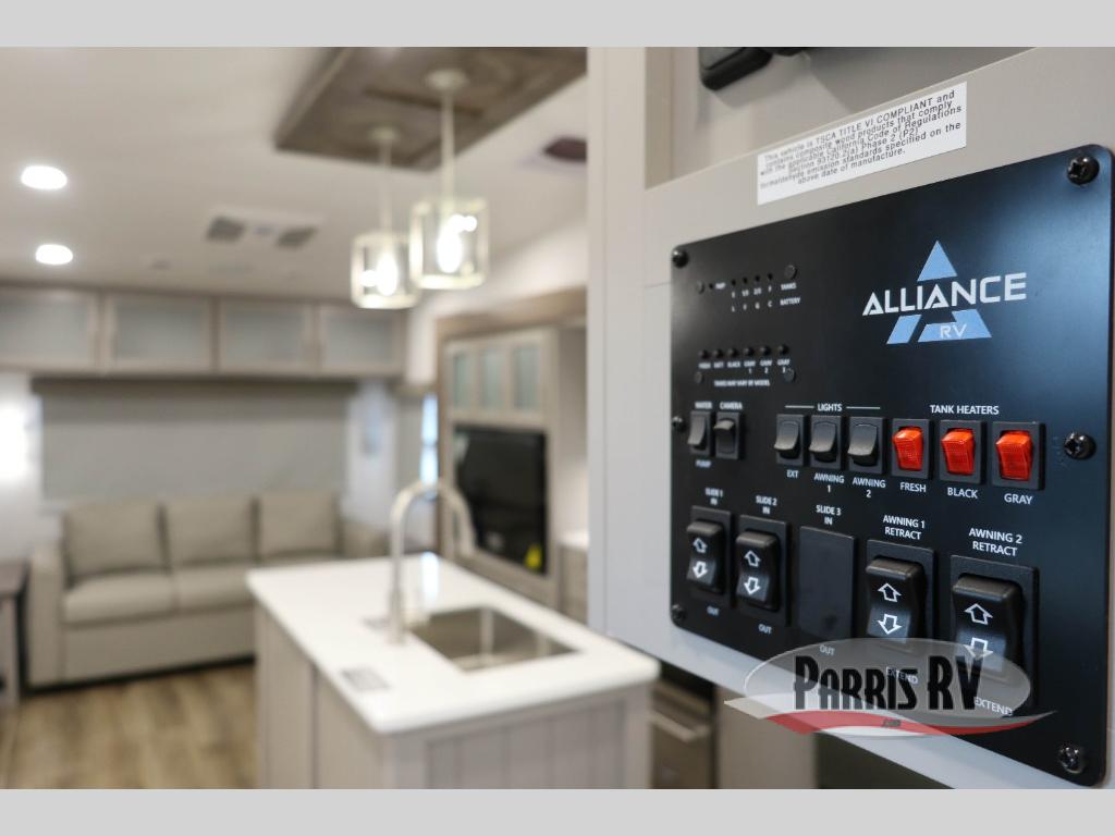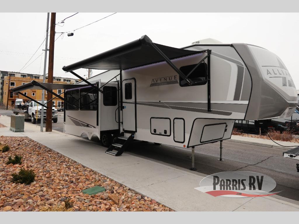 A benchmark chassis creates a space saver upper deck with each one of these Avenue All-Access fifth wheels by Alliance RV! The 101 in. wide-body construction gives you more room to walk around and the flush slide out floors throughout prevent any tripping. There are Azdel composite sidewalls inside and out, and a seamless fully walkable PVC roof for extreme durability and zero maintenance. You are sure to love the "no carpet zone" making each Avenue easy to clean and allergen free, not to mention pet friendly. You can maximize your space throughout with innovative storage solutions like the hidden storage behind the TV, inside the end tables, ottoman, and dinette chairs. These units also include the OTG Solar Package with a 200 watt solar panel, 15 amp MPPT charger, multiple outlets, and more to keep you powered up!