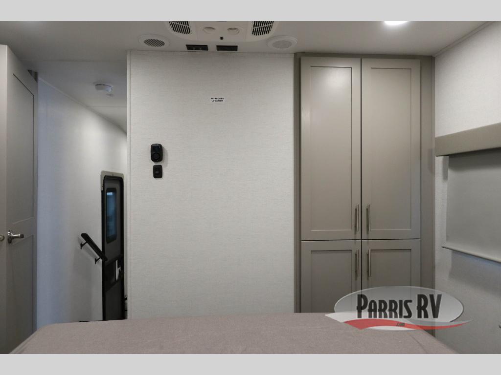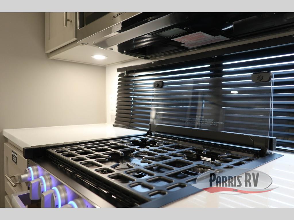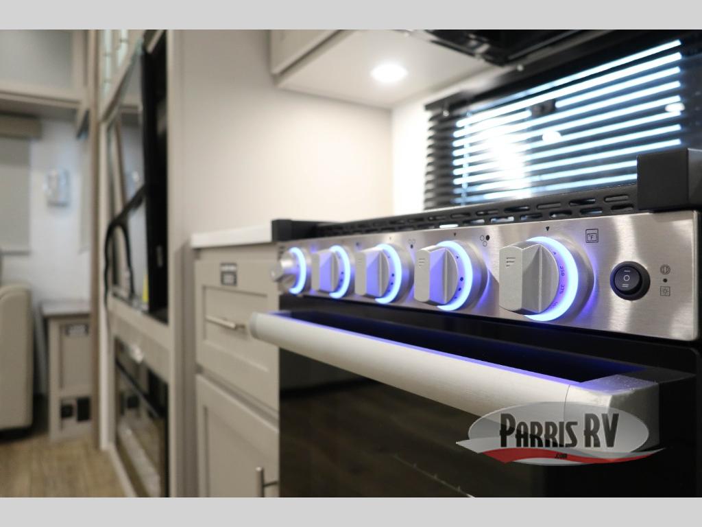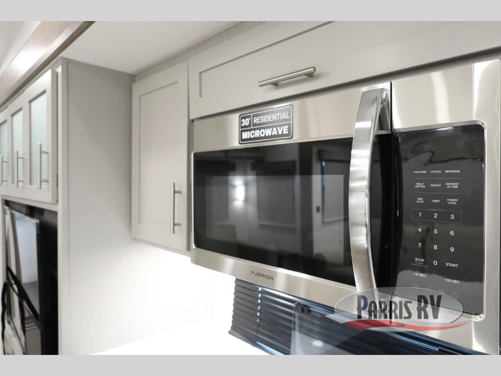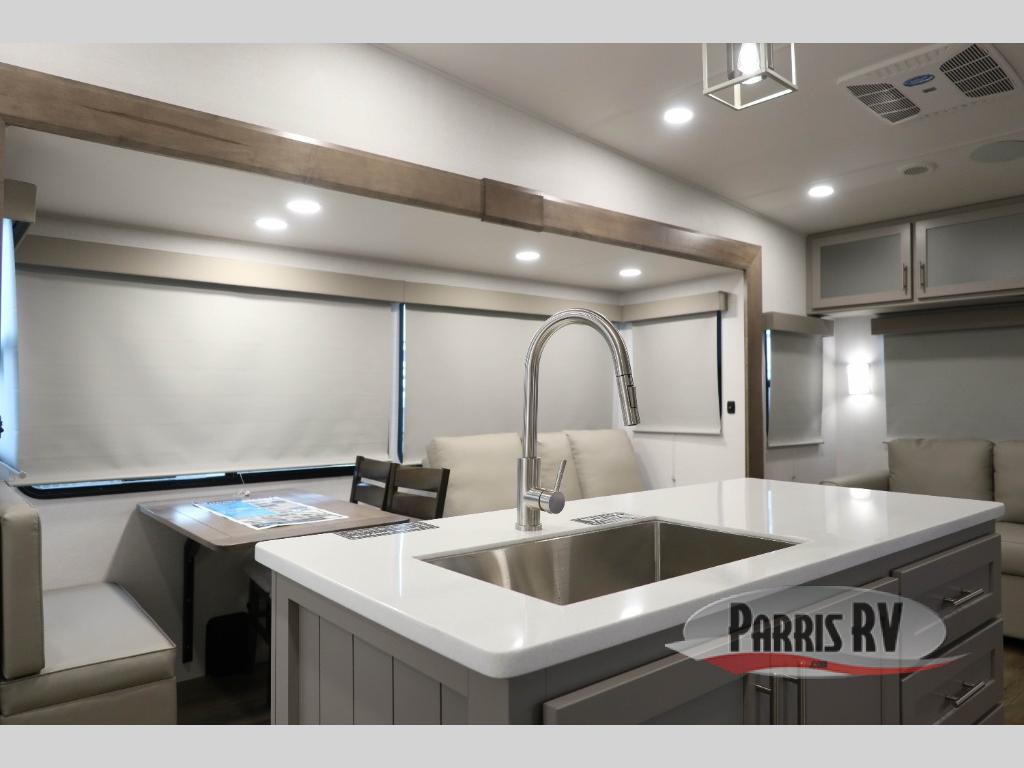 For the couple that enjoys adventures, this rear living coach has everything you need to travel comfortably and take along a couple of friends! The front private bedroom has a queen bed with nightstands on either side for your personal belongings, and a wardrobe to keep your clothes looking nice. Freshen up each morning in the full bathroom with a 30" x 36" shower, and grab a towel stored close by in the linen closet. Now that you're ready for the day, you can head to the kitchen and create a hearty breakfast with the full kitchen amenities. You will appreciate having a 10 cu. ft. 12V refrigerator and three burner cooktop, plus there is a center island with plenty of counter space and a sink to make food prep even easier. Spend your evenings in true relaxation in the dual recliner theater seats across from the swing mount 50" HDTV with hidden storage behind. You will also love the pantry and hutch in the kitchen area for storing all of your dishes and non-perishables. Dine at the floating table with two chairs along with a moveable ottoman featuring storage.
