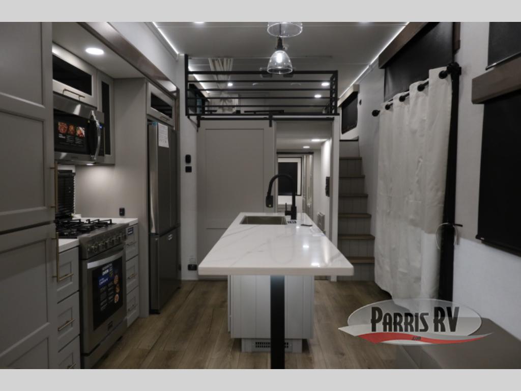 This destination trailer is perfect for a big crowd since it has one Power Tiling king bed, three mattress and an L- shape sofa where 10 people can easily fit. Experience the in-home feeling with the amazing kitchen and living room, furnished with a Kitchen island, L- shape sofa and a residential 110 V fridge. Also, you can sense the extreme coziness thanks to the dual fire places and get 24/7 entertainment due to the four TVs along the trailer. Plenty of place can be found in the front and rear loft bedrooms with three wardrobes in total. Lastly the two full bathrooms will allow you to comfortably take a shower after a long day.