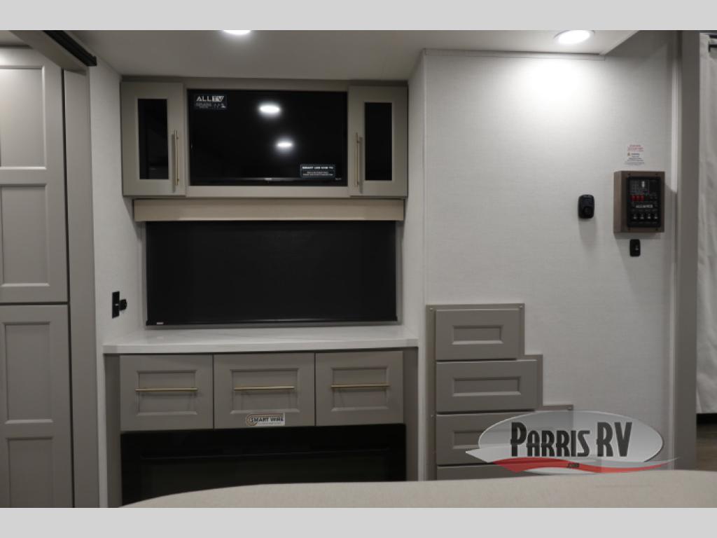 With any Benchmark destination trailer by Alliance RV, you will enjoy luxury features at every turn! The high gloss fiberglass exterior is ultra sleek, and the Azdel composite fiberglass sidewalls add durability so you can camp for years to come. You'll also find a residential exterior garden hose connection outside, along with a powder coated aluminum rear ladder, and an auxiliary LP tank hook up if you want to bring your grill along. Head inside to find hardwood cabinetry, solid surface countertops throughout, oversized windows in all rooms, and MCD roller shades throughout. The 45,000 BTU A/C and 60,000 BTU furnace will keep you comfortable year around, and there is a stackable washer and dryer to make full-time RV living easier than ever!