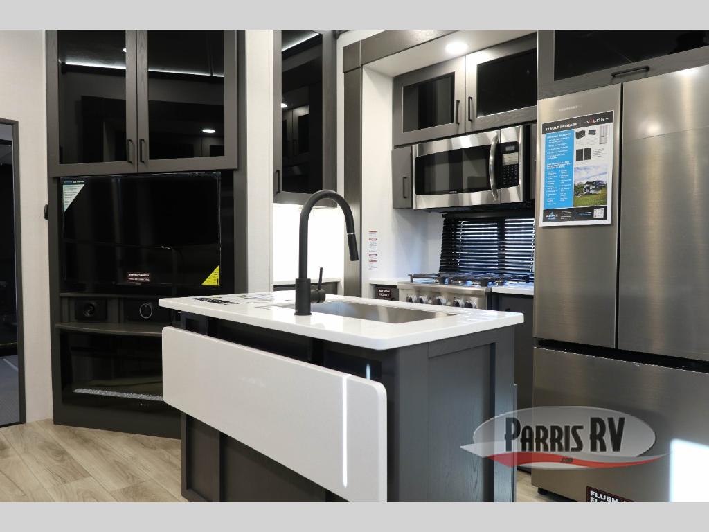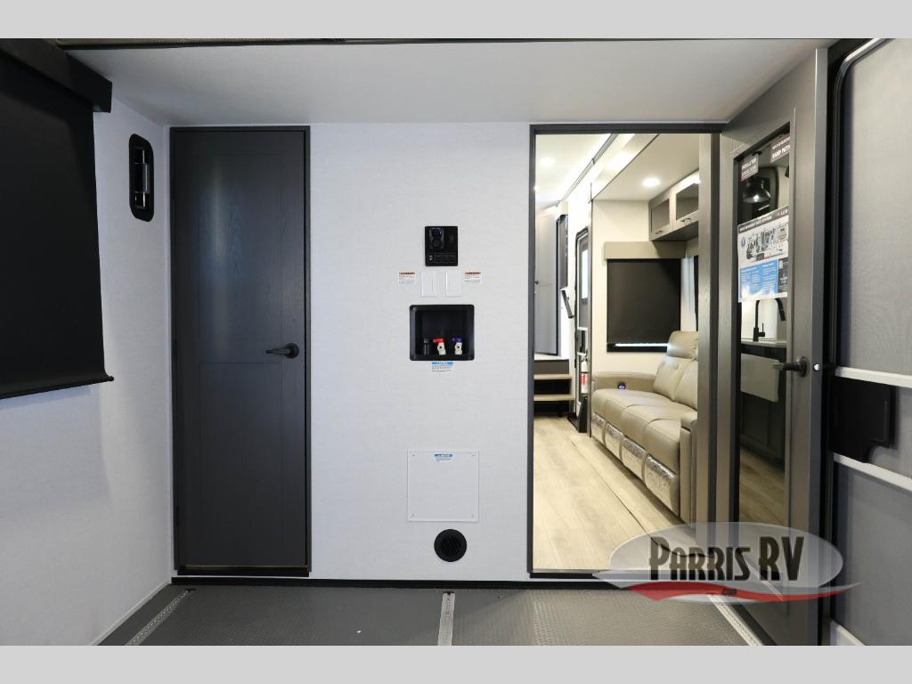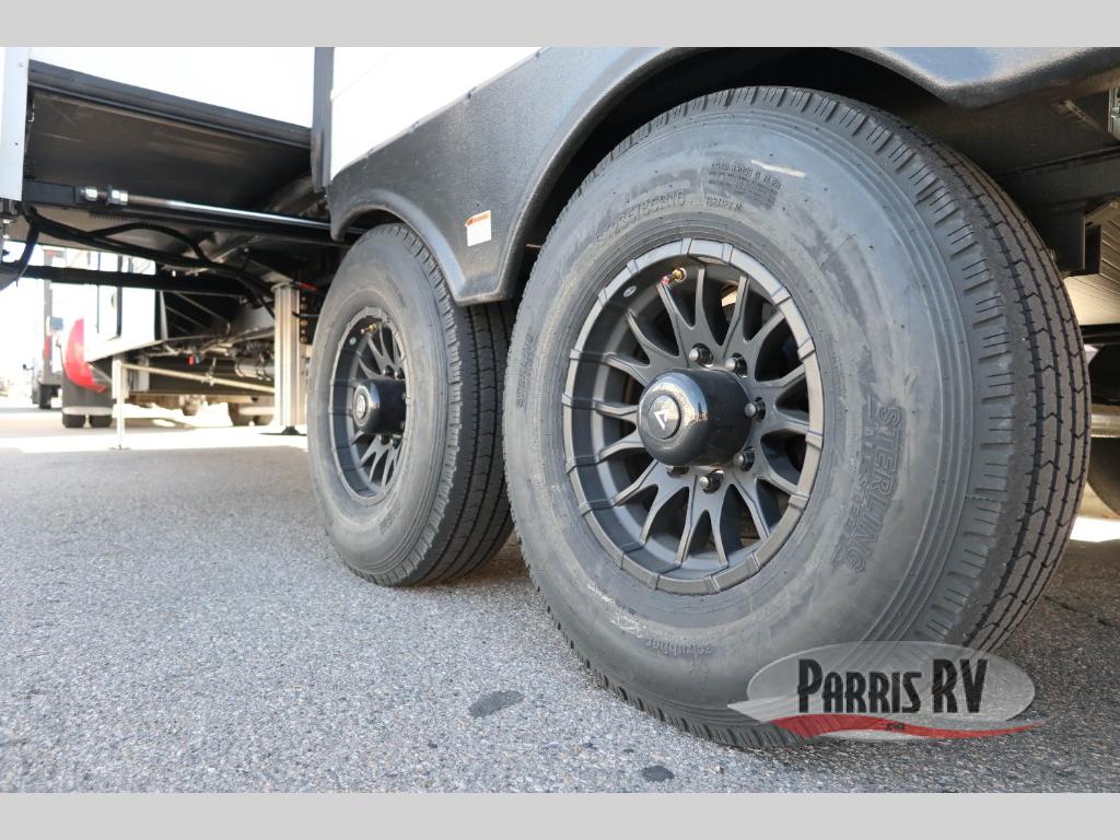 You can bring your toys with you wherever you go with any one of these Alliance RV Valor toy hauler fifth wheels! They are adventure-ready with a quality build from the walk on roof with seamless PVC roof covering to the commercial grade vinyl flooring and MorRyde CRE3000 suspension system. The Performance Running Gear package comes with a 101" wide-body benchmark chassis platform, 7,000 lb. Dexter axles, and a space enhancing drop frame storage compartment to pack in all your riding gear. You can even go off-gridding thanks to the Off the Grid Pack that has two 400 watt solar panels, generator prep, a 40 amp charge controller, and a 100 amp hour lithium iron phosphate battery. Some of the interior comforts you will enjoy are the hardwood cabinet doors and drawers, solid surface kitchen countertops, and commercial grade vinyl flooring with no carpet to make clean up a breeze. The Valor toy haulers are also the Masters of 12 Volt with USB charging station throughout, a stainless steel refrigerator, and more 12 volt features to make camping hassle-free!