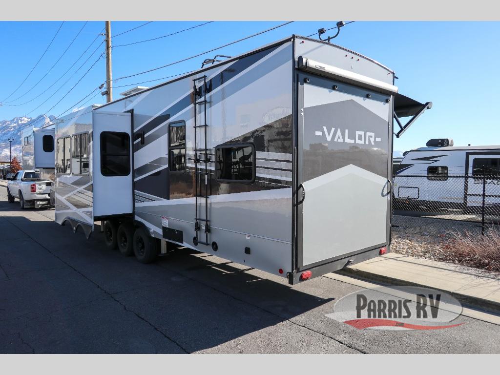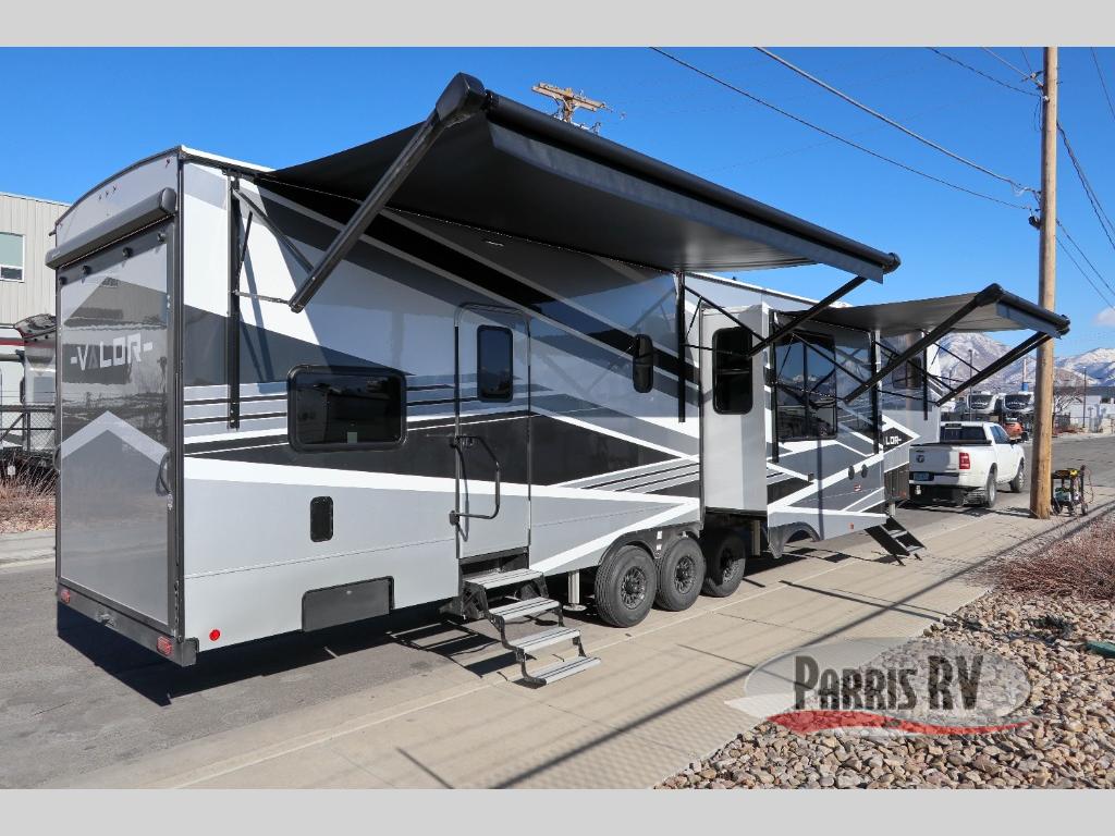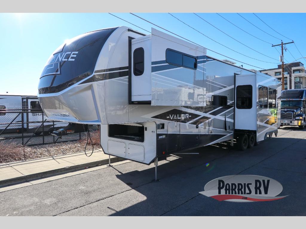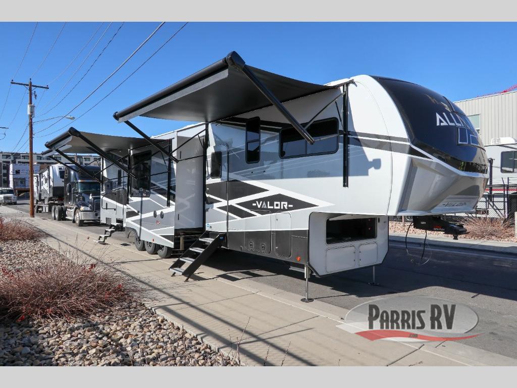 You can bring your toys with you wherever you go with any one of these Alliance RV Valor toy hauler fifth wheels! They are adventure-ready with a quality build from the walk on roof with seamless PVC roof covering to the commercial grade vinyl flooring and MorRyde CRE3000 suspension system. The Performance Running Gear package comes with a 101" wide-body benchmark chassis platform, 7,000 lb. Dexter axles, and a space enhancing drop frame storage compartment to pack in all your riding gear. You can even go off-gridding thanks to the Off the Grid Pack that has two 320 watt solar panels, generator prep, a 40 amp charge controller, and a 100 amp hour lithium iron phosphate battery, plus a battery monitor system. Some of the interior comforts you will enjoy are the hardwood cabinet doors and drawers, solid surface kitchen countertops, and commercial grade vinyl flooring with no carpet to make clean up a breeze. The Valor toy haulers are also the Master of 12 Volt with USB charging station throughout, power recliners, a 17 cu. ft. refrigerator, and more 12 volt features to make camping hassle-free!