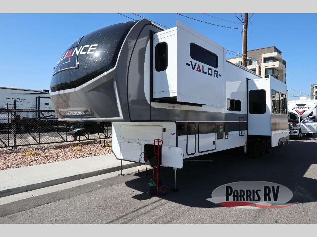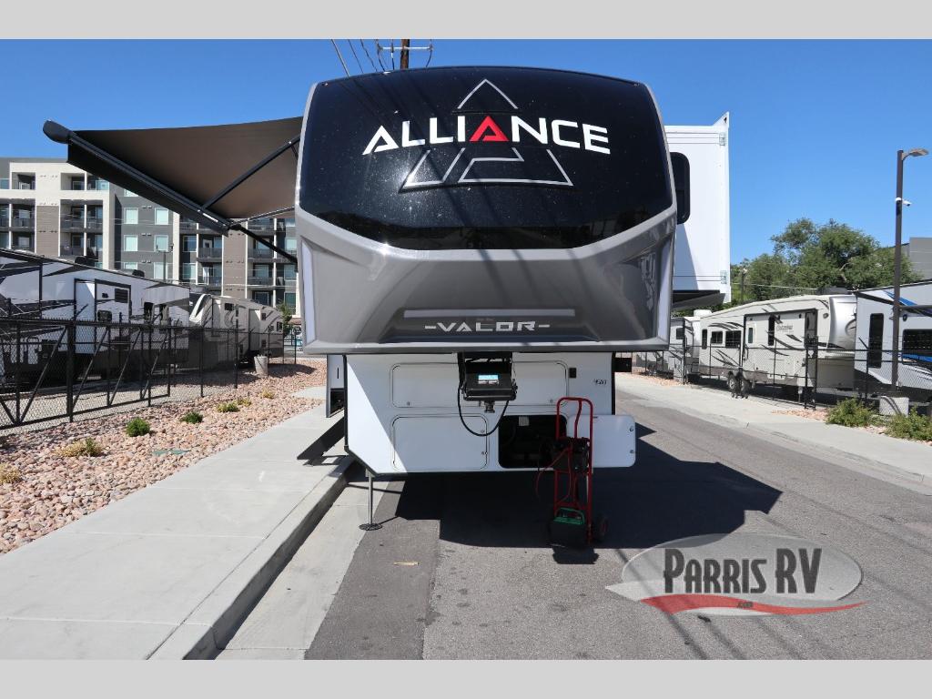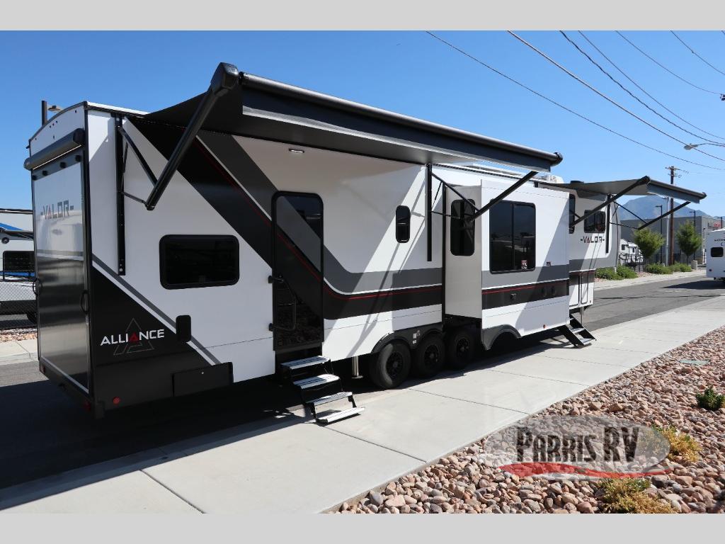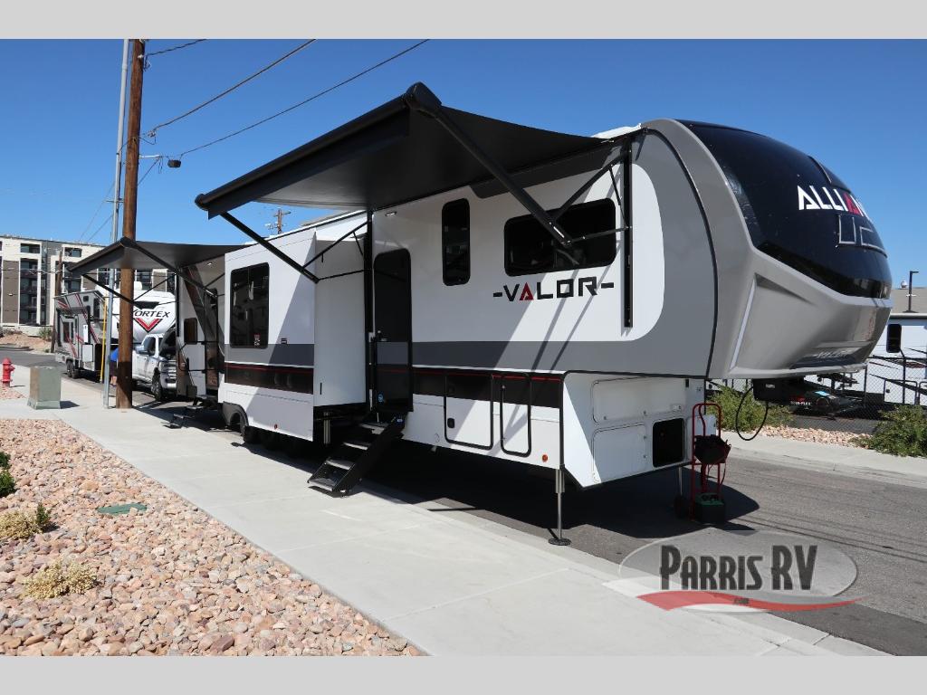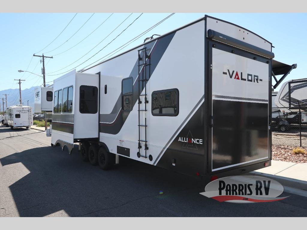 You can bring your toys with you wherever you go with any one of these Alliance RV Valor toy hauler fifth wheels! They are adventure-ready with a quality build from the walk on roof with seamless PVC roof covering to the commercial grade vinyl flooring and MorRyde CRE3000 suspension system. The Performance Running Gear package comes with a 101" wide-body benchmark chassis platform, 7,000 lb. Dexter axles, and a space enhancing drop frame storage compartment to pack in all your riding gear. You can even go off-gridding thanks to the Off the Grid Pack that has two 320 watt solar panels, generator prep, a 40 amp charge controller, and a 100 amp hour lithium iron phosphate battery, plus a battery monitor system. Some of the interior comforts you will enjoy are the hardwood cabinet doors and drawers, solid surface kitchen countertops, and commercial grade vinyl flooring with no carpet to make clean up a breeze. The Valor toy haulers are also the Master of 12 Volt with USB charging station throughout, power recliners, a 17 cu. ft. refrigerator, and more 12 volt features to make camping hassle-free!