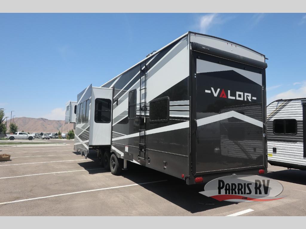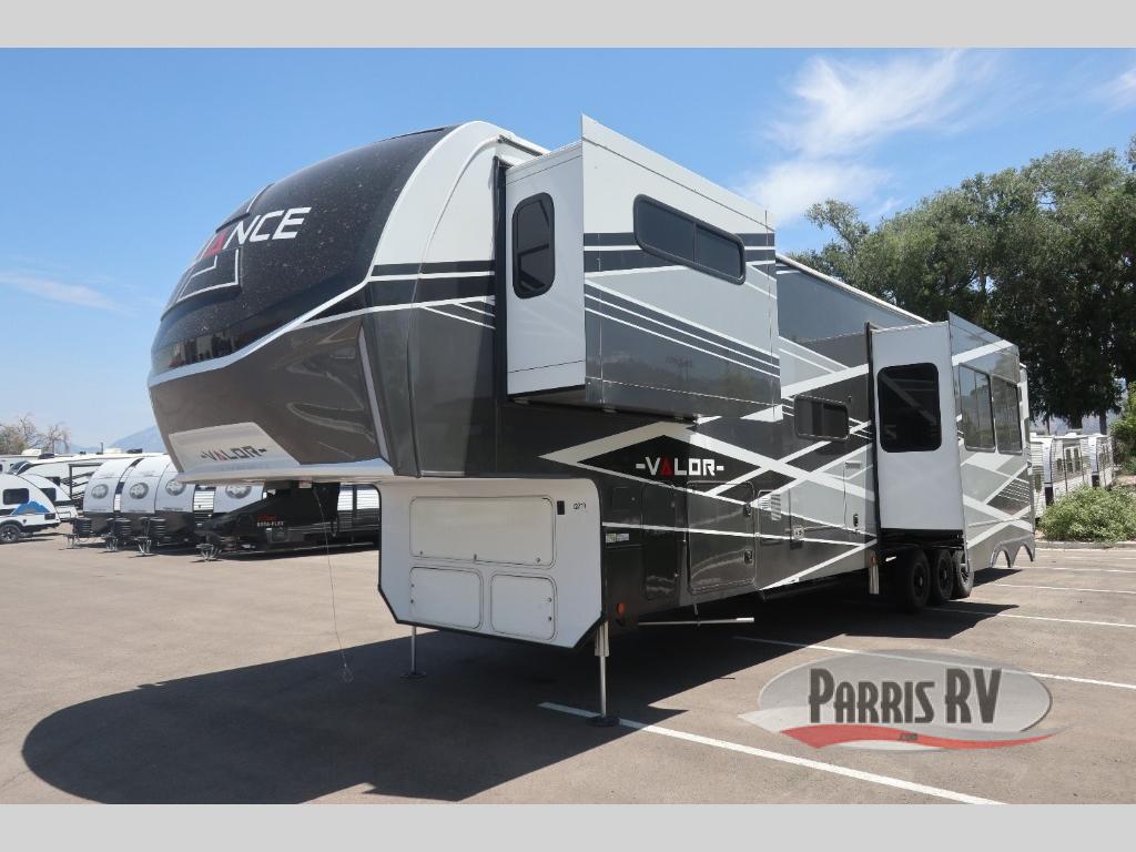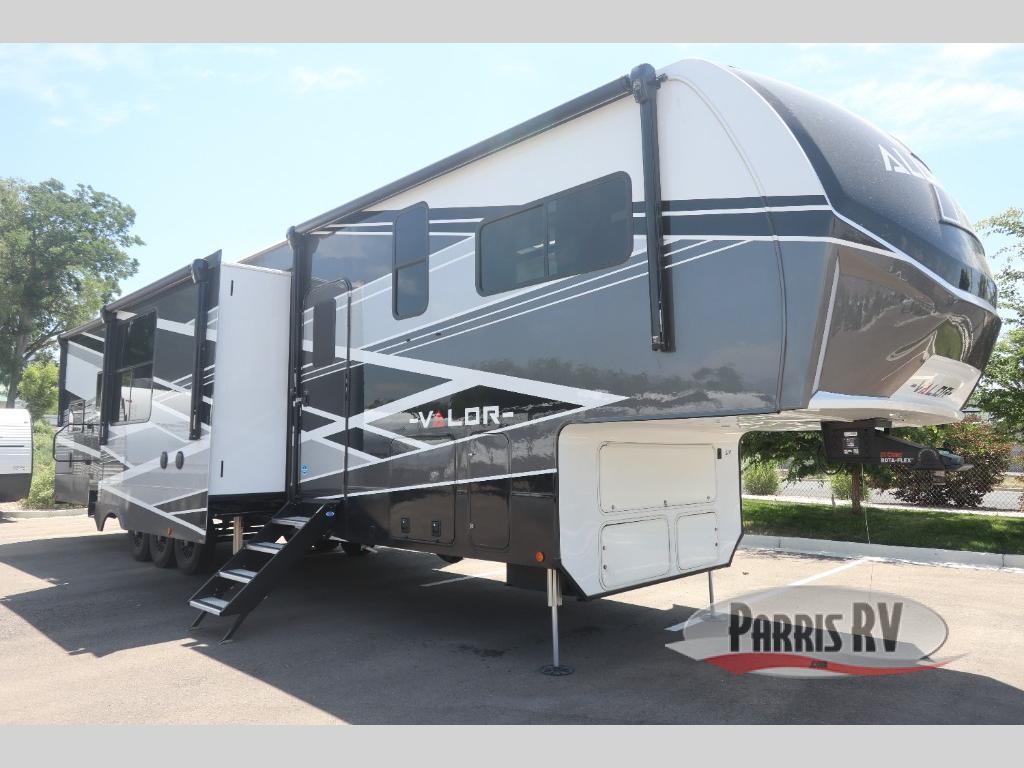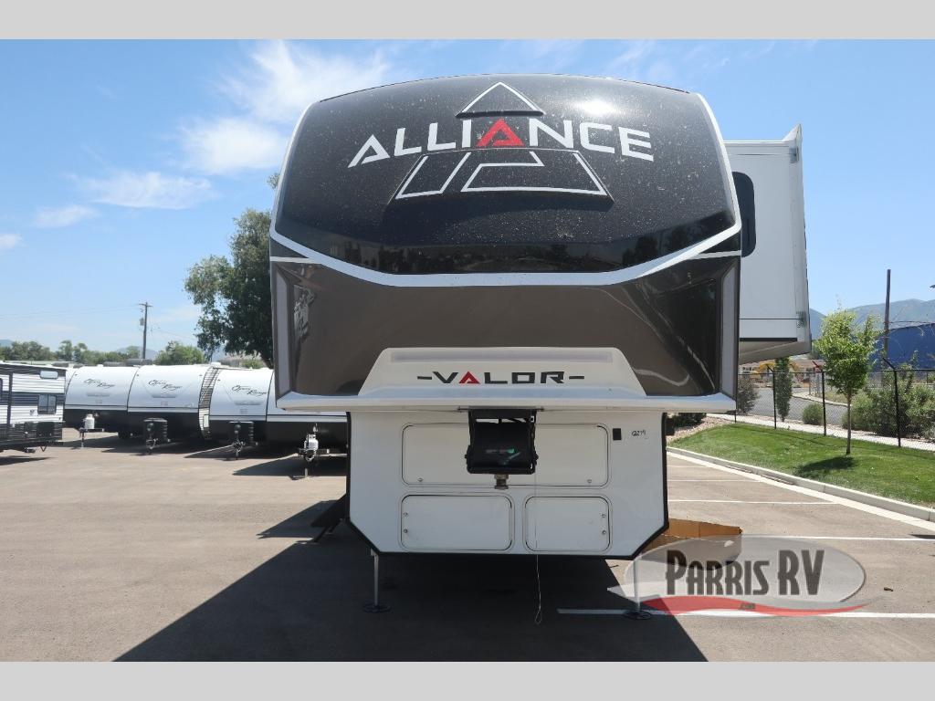 You can bring your toys with you wherever you go with any one of these Alliance RV Valor toy hauler fifth wheels! They are adventure-ready with a quality build from the walk on roof with seamless PVC roof covering to the commercial grade vinyl flooring and MorRyde CRE3000 suspension system. The Performance Running Gear package comes with a 101" wide-body benchmark chassis platform, 7,000 lb. Dexter axles, and a space enhancing drop frame storage compartment to pack in all your riding gear. You can even go off-gridding thanks to the Off the Grid Pack that has two 400 watt solar panels, generator prep, a 40 amp charge controller, and a 100 amp hour lithium iron phosphate battery. Some of the interior comforts you will enjoy are the hardwood cabinet doors and drawers, solid surface kitchen countertops, and commercial grade vinyl flooring with no carpet to make clean up a breeze. The Valor toy haulers are also the Master of 12 Volt with USB charging station throughout, a stainless steel refrigerator, and more 12 volt features to make camping hassle-free!