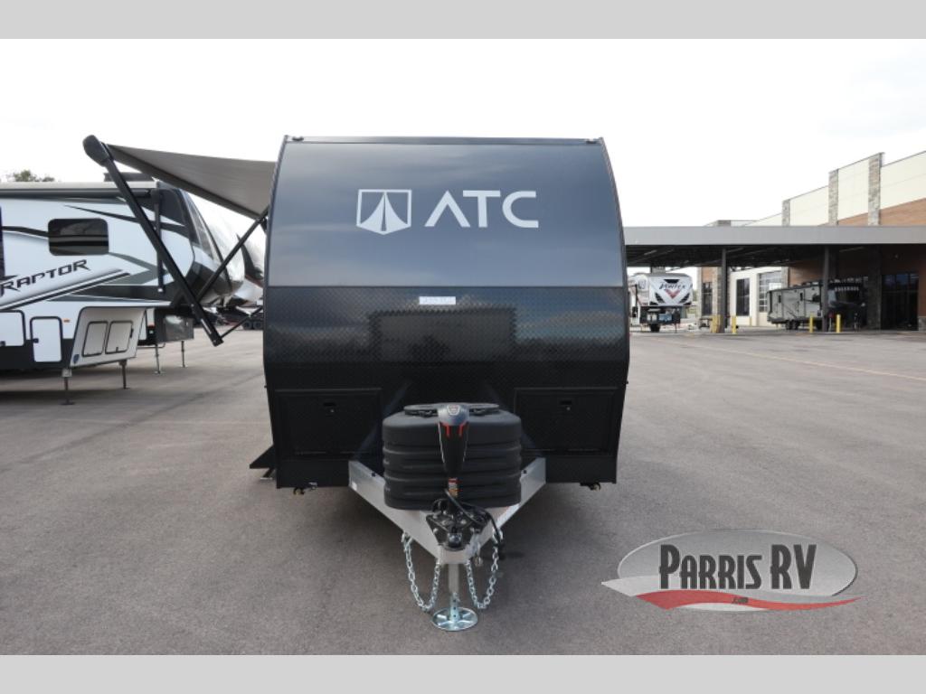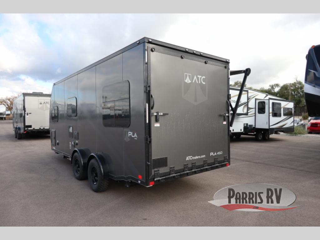 With any PLA 450 toy hauler travel trailer by ATC Trailers, you will enjoy lightweight towing and a configurable garage space for your toys, gear, and more! The all-aluminum and composite construction features no wood so you won't have to worry about rot, and the All-Weather Protection Package means you can extend your camping season. There is a 200-watt solar panel with a solar port, lithium battery prep, plus 12V outlets to keep your adventures going. Outside, you'll find storage for your gear, a power awning with a light strip, sleek frameless dual pane tinted windows, and more convenient features. The interior is just as accommodating with its dimmable ceiling lights throughout, decorative backsplash, configurable furniture track system, blackout roller shades, and the list of comforts goes on!