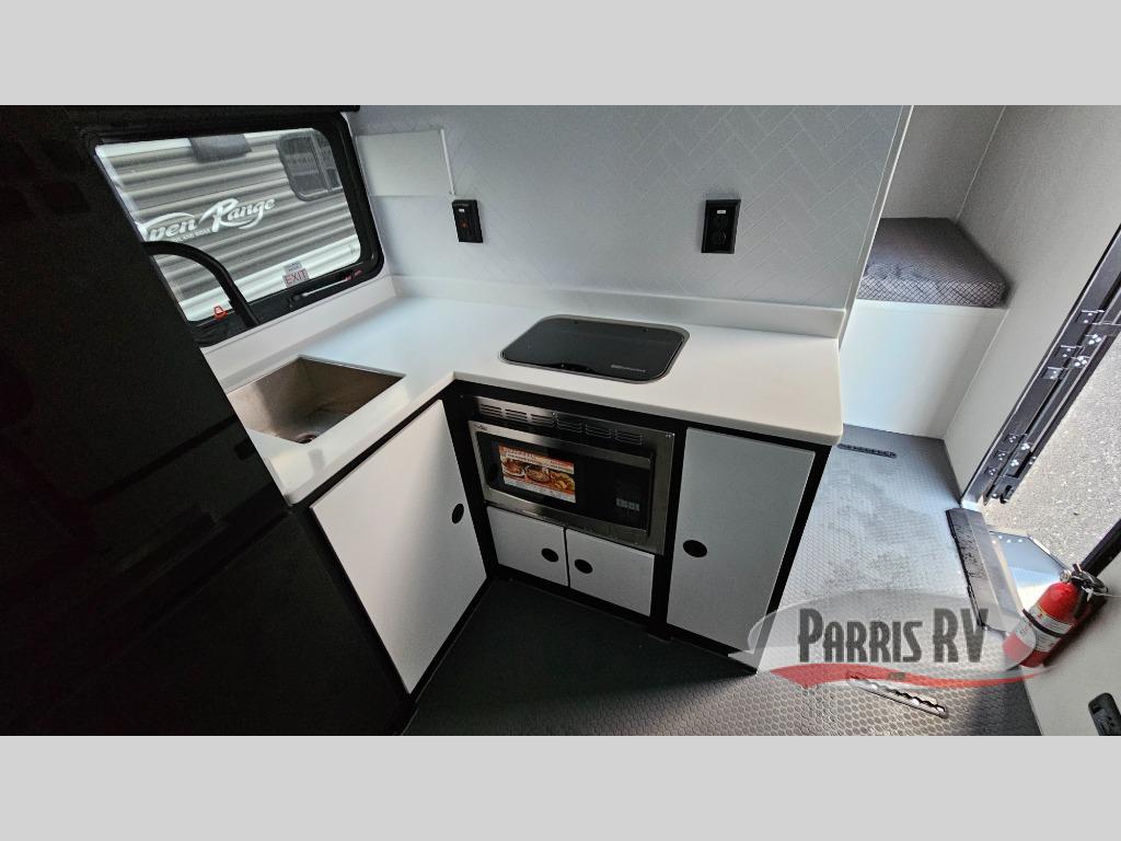 Grab your riding helmet and load up your bikes in this toy hauler! Once your toys are unloaded from the cable-less ramp door with non-slip tread, you can relax on the sofa here or make lunch in the kitchen. There is a flush mount two burner LP cooktop and a convection microwave, plus a 12V refrigerator to store leftovers. The wet bath includes a shower and porcelain toilet so you can freshen up after a trail ride, and the front bunk beds with reading lamps will let you stay up late with a good book!
