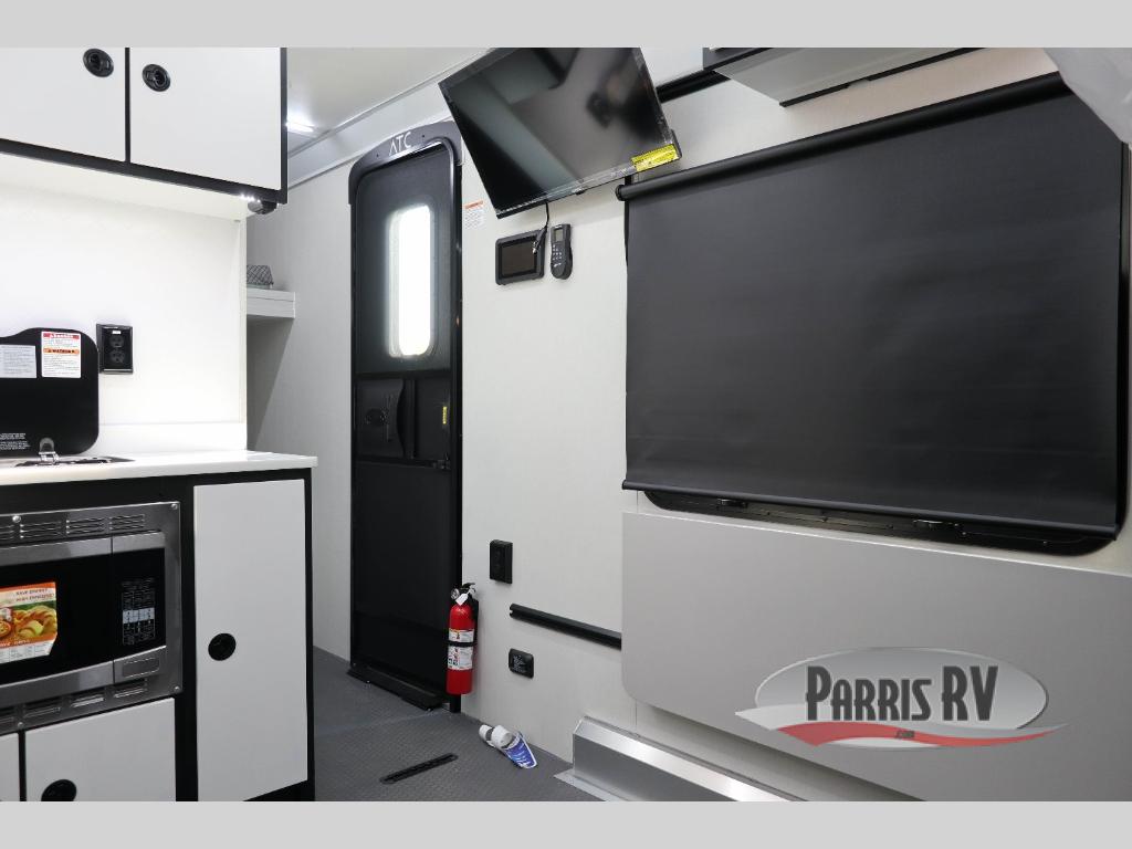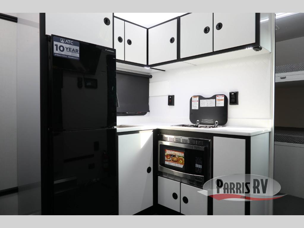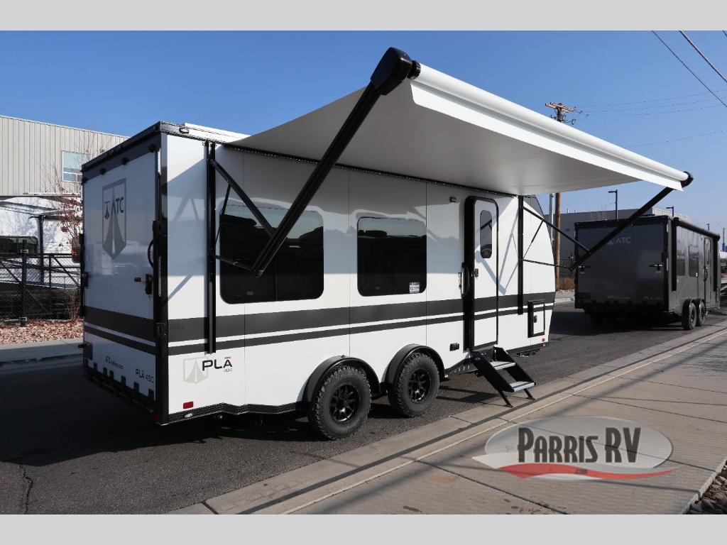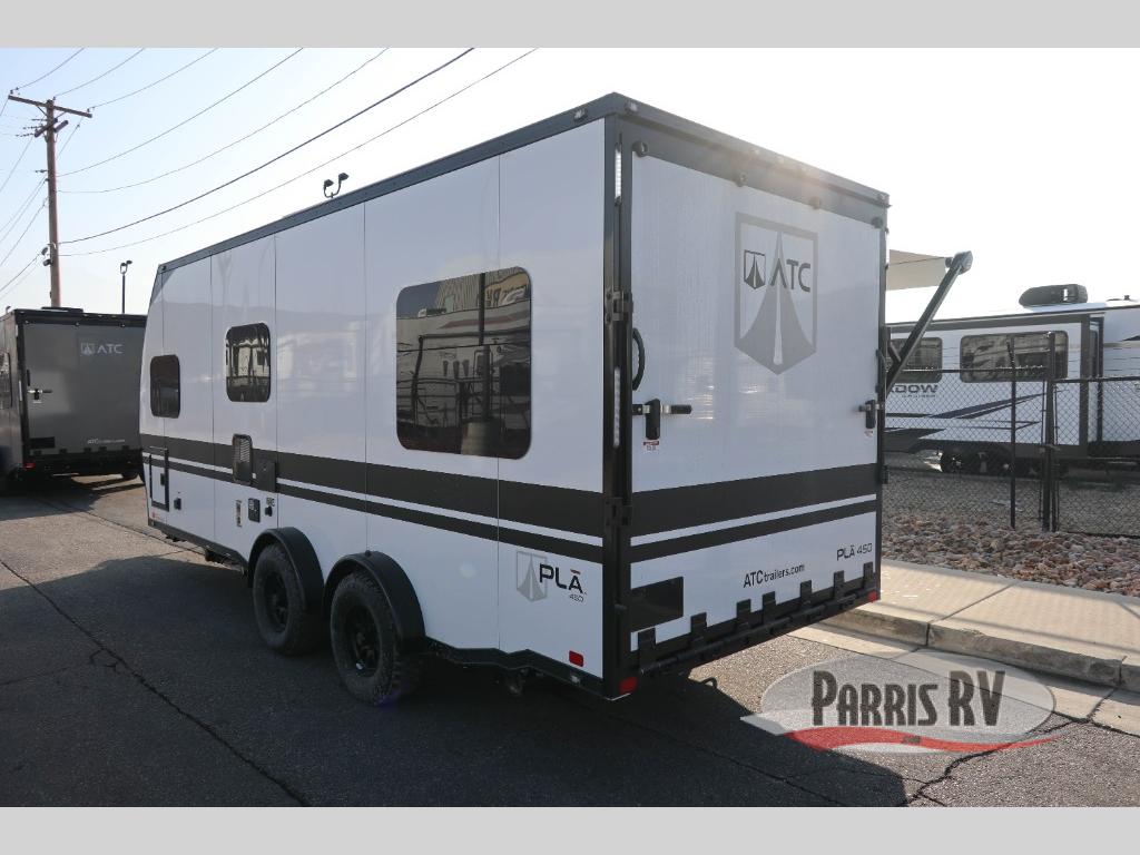 With any PLA 450 toy hauler travel trailer by ATC Trailers, you will enjoy lightweight towing and a configurable garage space for your toys, gear, and more! The all-aluminum and composite construction features no wood so you won't have to worry about rot, and the All-Weather Protection Package means you can extend your camping season. There is a 200-watt solar panel with a solar port, lithium battery prep, plus 12V outlets to keep your adventures going. Outside, you'll find storage for your gear, a power awning with a light strip, sleek frameless dual pane tinted windows, and more convenient features. The interior is just as accommodating with its dimmable ceiling lights throughout, decorative backsplash, configurable furniture track system, blackout roller shades, and the list of comforts goes on!