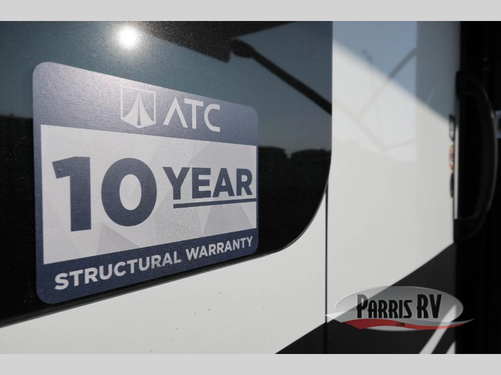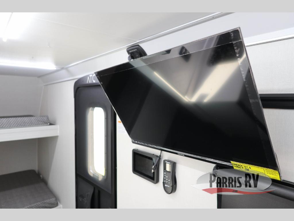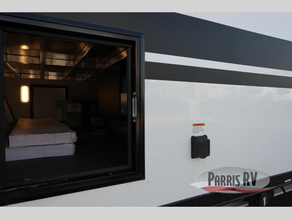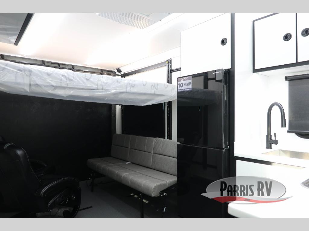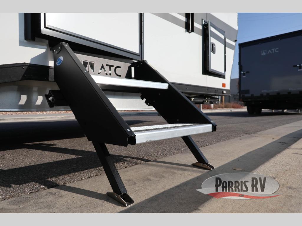 With any PLA 450 toy hauler travel trailer by ATC Trailers, you will enjoy lightweight towing and a configurable garage space for your toys, gear, and more! The all-aluminum and composite construction features no wood so you won't have to worry about rot, and the All-Weather Protection Package means you can extend your camping season. There is a 200-watt solar panel with a solar port, lithium battery prep, plus 12V outlets to keep your adventures going. Outside, you'll find storage for your gear, a power awning with a light strip, sleek frameless dual pane tinted windows, and more convenient features. The interior is just as accommodating with its dimmable ceiling lights throughout, decorative backsplash, configurable furniture track system, blackout roller shades, and the list of comforts goes on!
