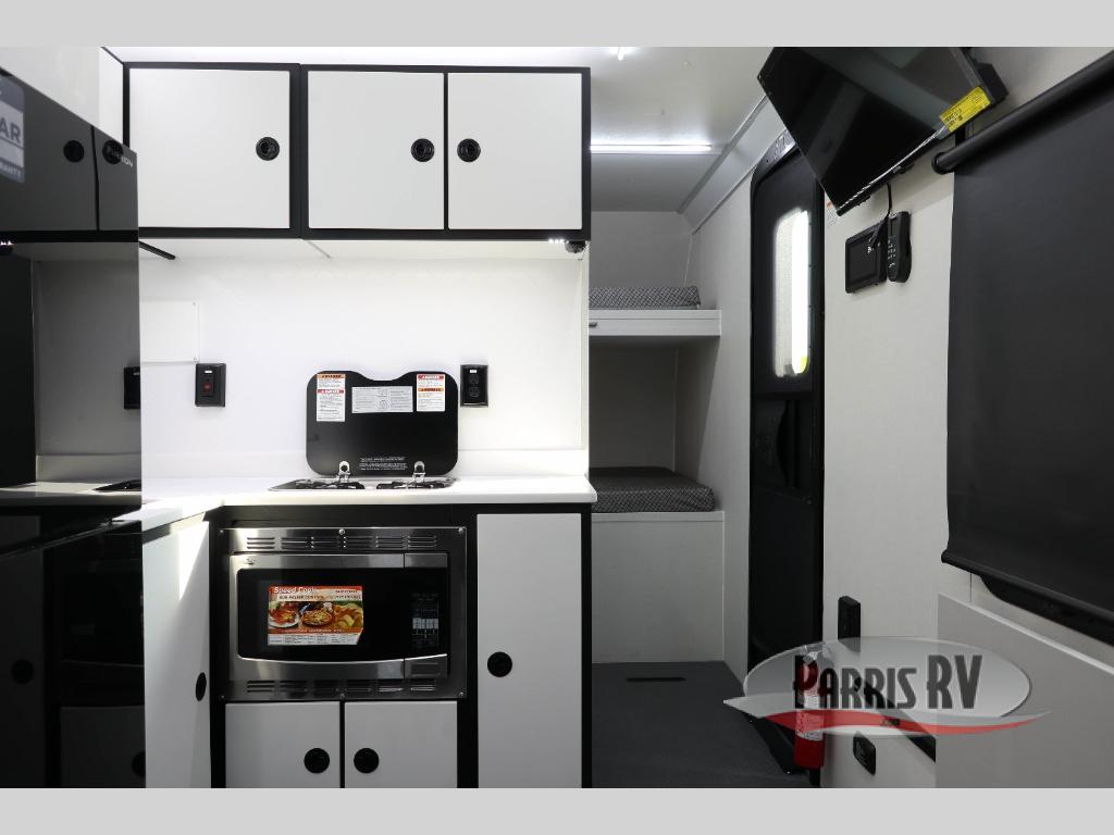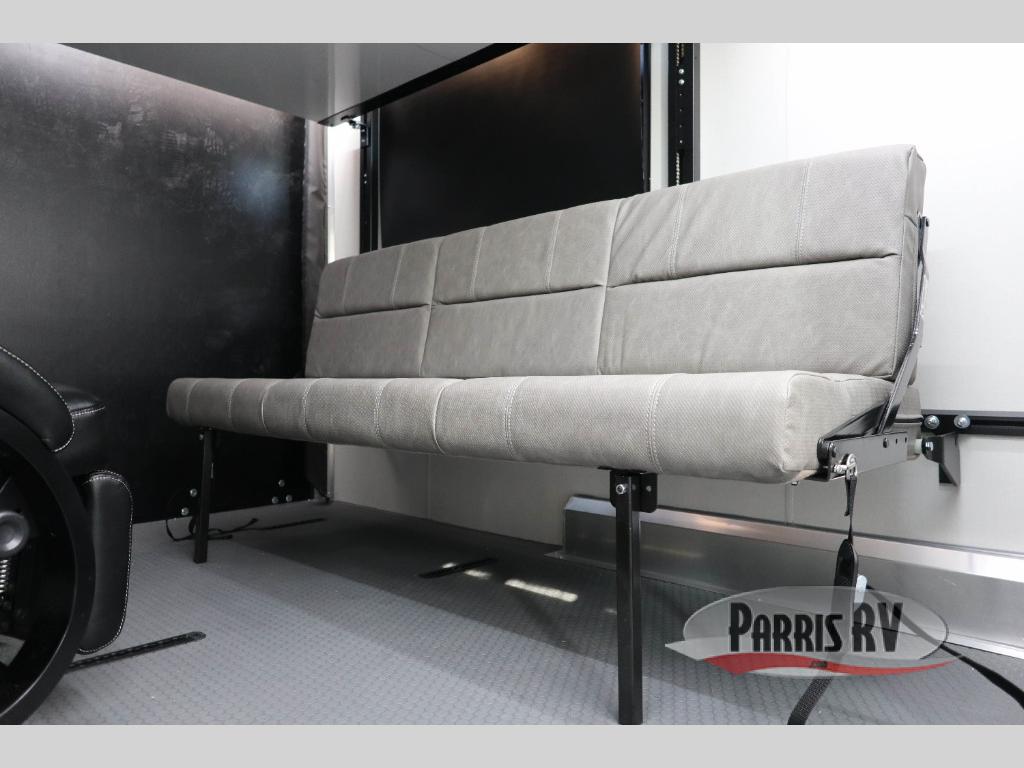 Grab your riding helmet and load up your bikes in this toy hauler! Once your toys are unloaded from the cable-less ramp door with non-slip tread, you can relax on the sofa here or make lunch in the kitchen. There is a flush mount two burner LP cooktop and a convection microwave, plus a 12V refrigerator to store leftovers. The wet bath includes a shower and porcelain toilet so you can freshen up after a trail ride, and the front bunk beds with reading lamps will let you stay up late with a good book!