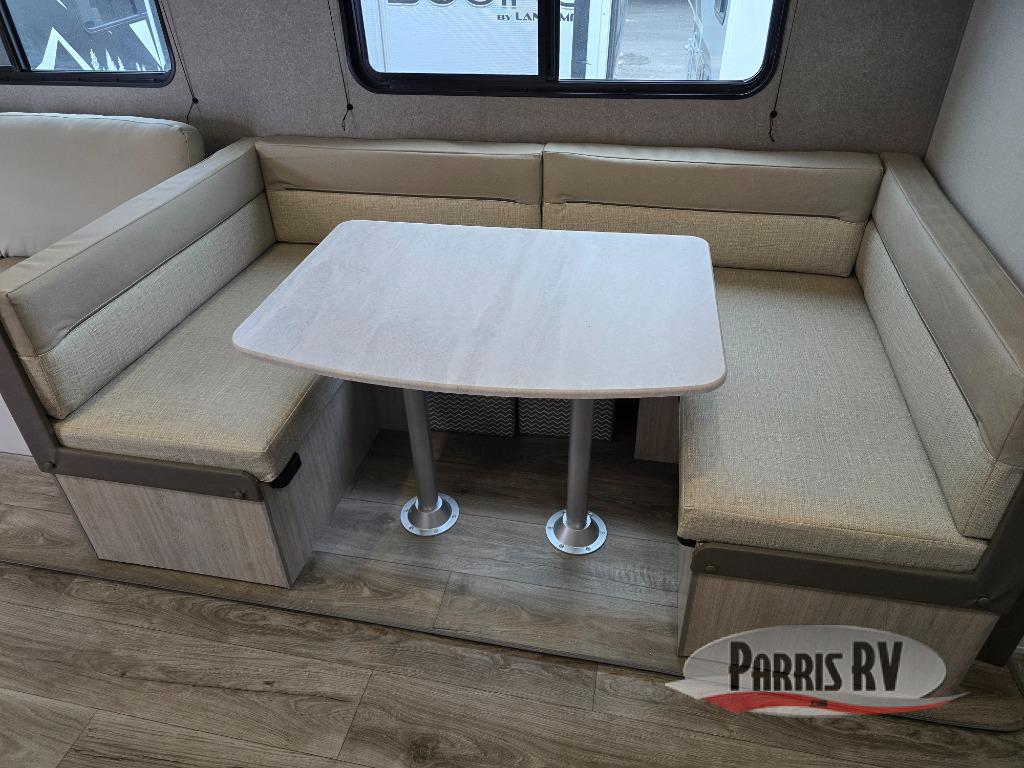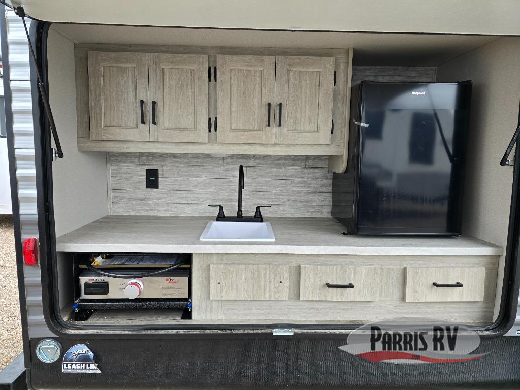 If you enjoy camping with family or a larger friend group, this trailer is sure to meet your needs! The rear private bunkhouse includes single-size bunks plus double-size bunks, allowing you to sleep up to six here alone! You'll have the 60" x 74" RV queen bed all to yourselves in the front master bedroom, and any additional guests can sleep on the U-shaped dinette and sofa within the large slide out. The chef of your group can use the GE stainless three burner cooktop or microwave oven to create meals each day, and an optional full-size exterior camp kitchen can be added if you enjoy cooking outdoors. The optional exterior kitchen replaces the lower bunk. A walk-in pantry includes washer and dryer prep if you choose to add these appliances, and everyone can stay clean all week thanks to the dual entry full bath!
