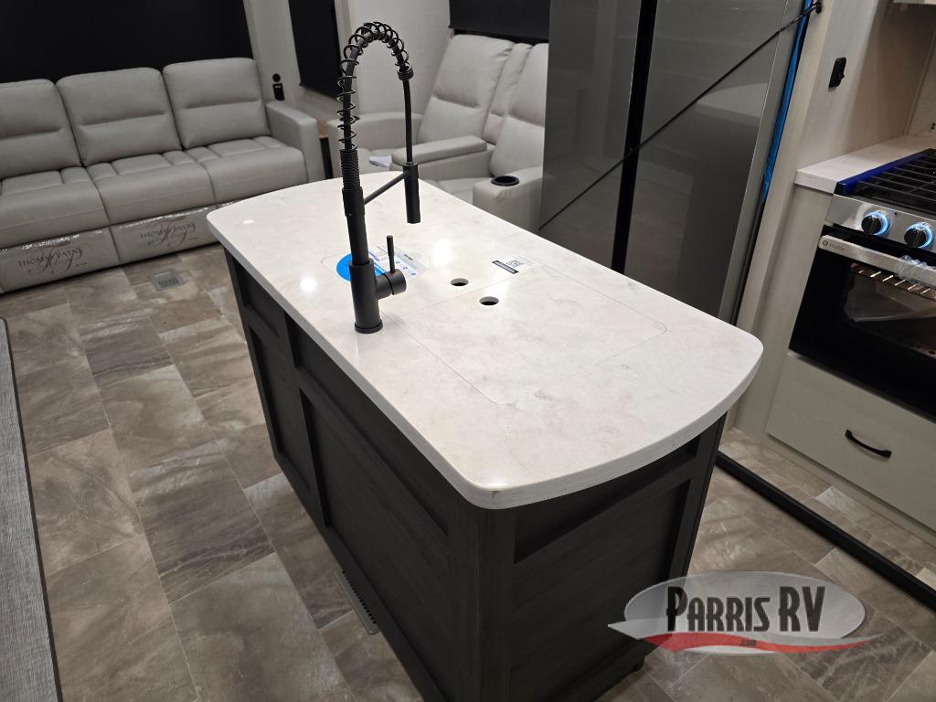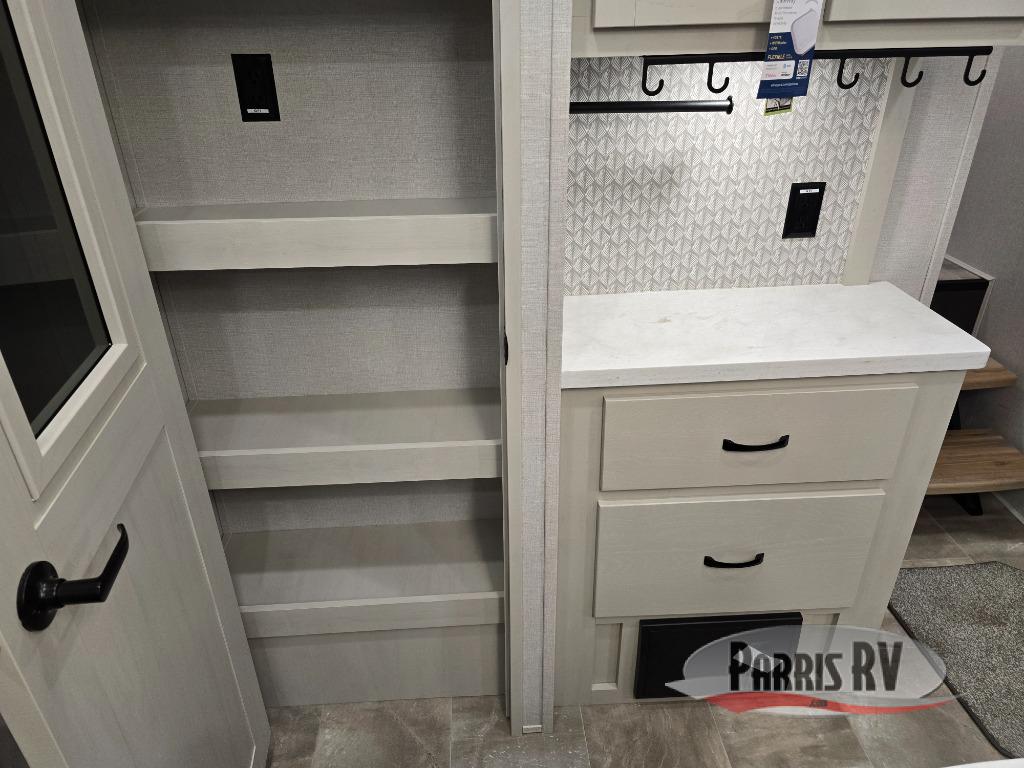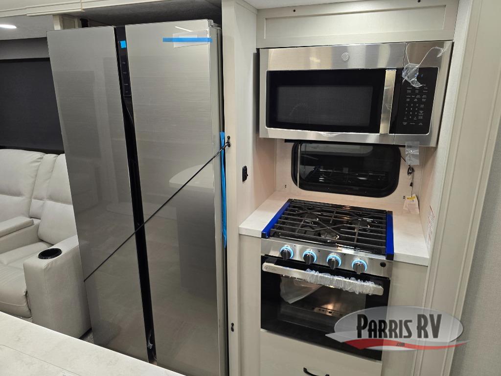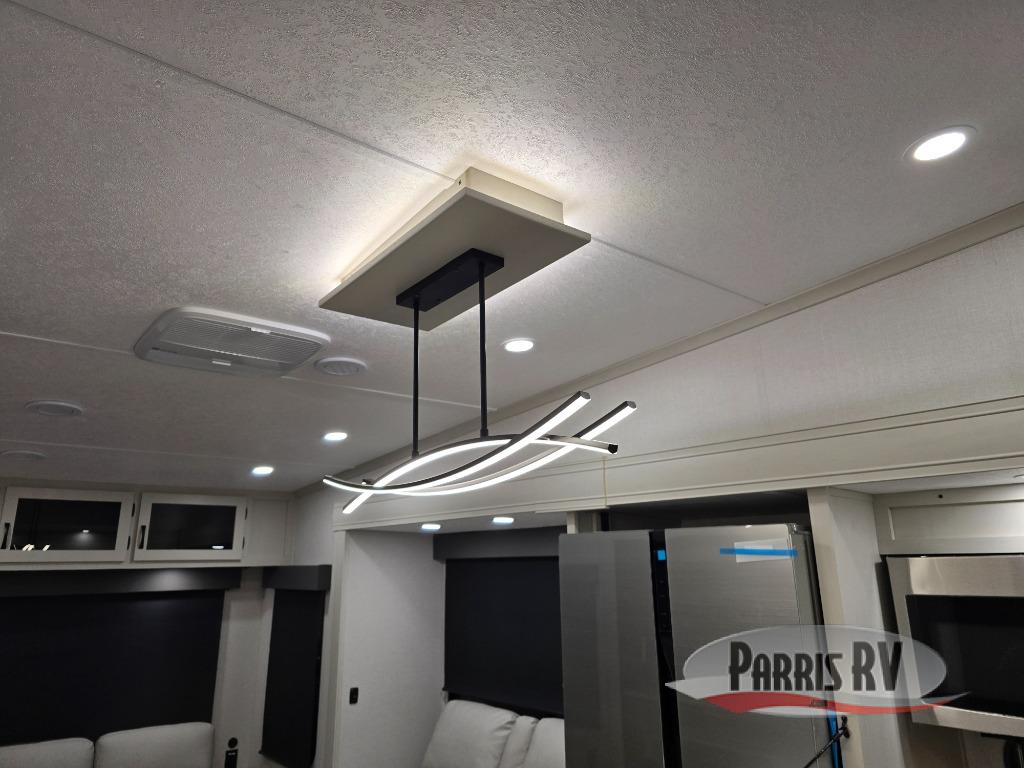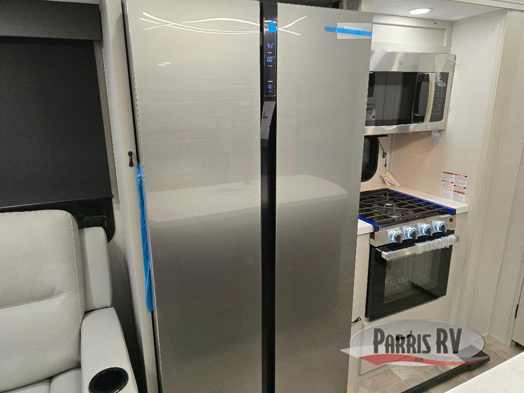 This lightest fifth wheel in the Chaparral line-up will provide hassle-free towing and camping. You will find dual opposing slides in the main living area for tons of space to stretch out, plus a kitchen island that will make this area feel more like home. There is theatre seating across from the entertainment center, and you can enjoy the 50" 4K Smart LED TV for movies. The fully-equipped kitchen includes a GE Profile stainless steel 30" residential microwave, a GE Profile 21" oven with a residential cooktop, and a overhead storage to keep kitchen necessities close by. And don't overlook the front private bedroom with a queen bed, dresser, plus a large wardrobe with washer and dryer prep!