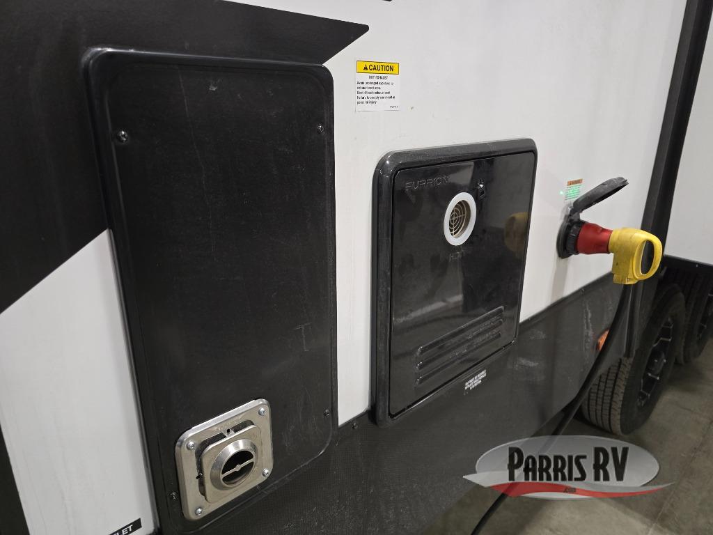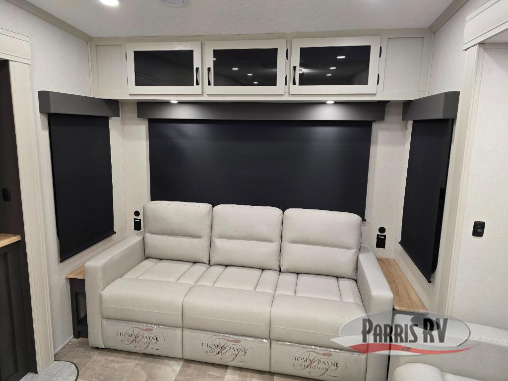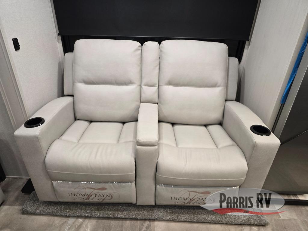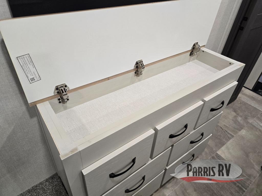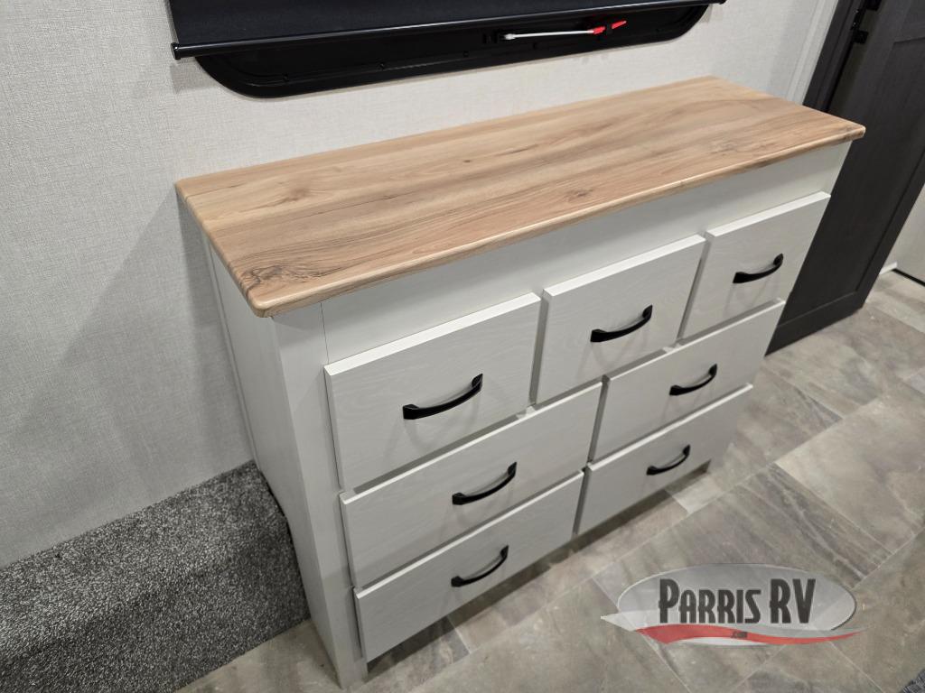 This lightest fifth wheel in the Chaparral line-up will provide hassle-free towing and camping. You will find dual opposing slides in the main living area for tons of space to stretch out, plus a kitchen island that will make this area feel more like home. There is theatre seating across from the entertainment center, and you can enjoy the 50" 4K Smart LED TV for movies. The fully-equipped kitchen includes a GE Profile stainless steel 30" residential microwave, a GE Profile 21" oven with a residential cooktop, and a overhead storage to keep kitchen necessities close by. And don't overlook the front private bedroom with a queen bed, dresser, plus a large wardrobe with washer and dryer prep!