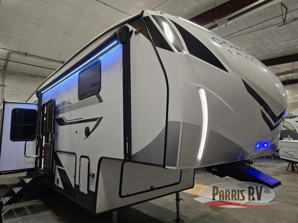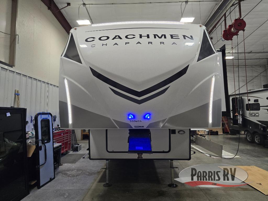 Each Chaparral mid-profile fifth wheel by Coachmen is designed with residential features, loads of storage space, and roomy bedroom suites to make you feel right at home. The durable construction means you can enjoy your RV for years to come. There's 6X double Azdel aluminum cage sidewall system, Weather Shield+ technology, and Tri-Tex powder coated frame technology that will allow you to camp year around. Each model includes a Winegard Air 360+ HDTV/radio dome antenna to help keep you connected as you camp, slow rise blackout roller night shades, a new 16 cu. ft. side-by-side stainless glass 12V refrigerator, and a modern electric fireplace to make your space cozy. There is also a large transom window in the kitchen, a modern high-rise faucet, LED motion sensor lights in the bathroom, plus a full-size shower with glass doors and a seat. Now that's what I call luxury! Choose a Chaparral fifth wheel today!