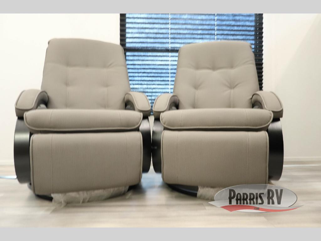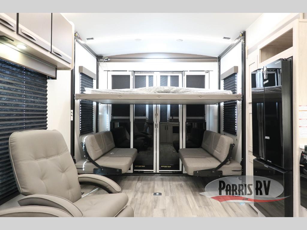 This king bed slide out floorplan is just what you've been looking for! You will feel right at home in the front master bedroom that also includes two dressers, a wardrobe, and your own private entrance to the dual entry bath. If you have any guests that tagged along, they can make their bed on the power queen bed above the opposing sofas with a dinette in the garage area. There are two lounge chairs where friends can sit while dinner is being made on the three burner range, and the kitchen pantry provides a place to store snacks galore! If the weather is nice, you might just want to cook outdoors on the two burner cooktop under the 20' power awning with LED lights.