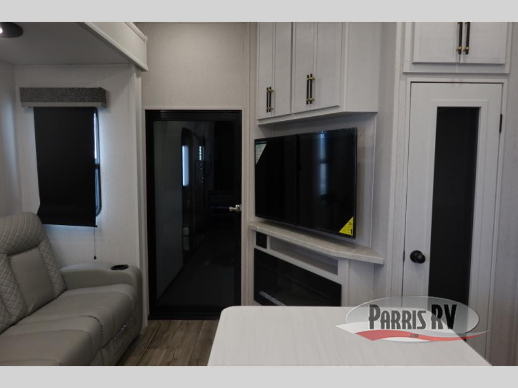 The Voltage V-Series by Dutchmen RV is a smaller and lighter weight choice when it comes to a toy hauler. These were designed with the same comforts that you would find in the standard Voltage models with the Signature Series collection including glazed cabinets with raised panel cabinet doors, modern hardware throughout, upgraded finishes and custom paint and stain. You will also enjoy the tankless water heater, garage Bed Lift System, Tuff Ply garage floor, and weight assisted ramp door for ease in loading and unloading your toys. A few bonus features like a 50" walk-in shower, 40" fireplace, and 30 gallon fuel station just makes your adventures that much more enjoyable! Come choose the Voltage V-Series as your new lightweight companion toy hauler today!