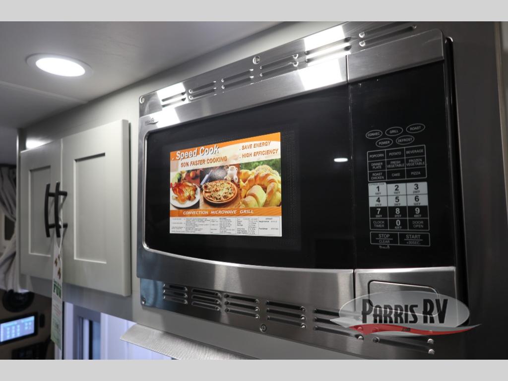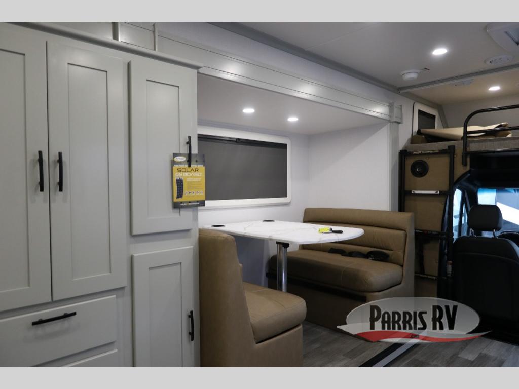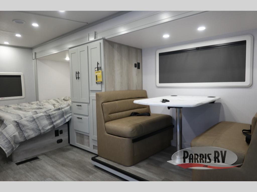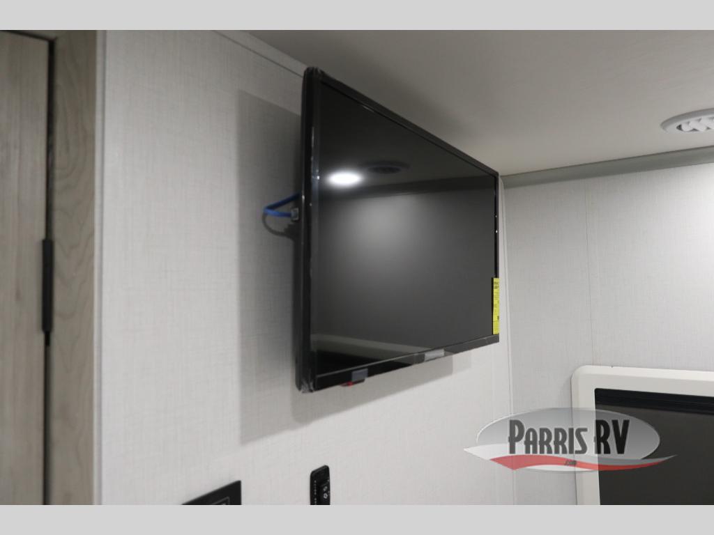 Take this motorhome on your greatest adventures yet! Start each morning feeling well rested after sleeping on the corner queen bed then head to the rear corner bathroom to freshen up in the shower with an Oxygenics body spa RV shower head and a skylight above for added headroom and natural lighting. Now that you're ready for the day, you can grab some eggs from the 8 cu. ft. two-door compressor-driven refrigerator and fry them up on the three burner cooktop, then enjoy them at the booth dinette. The kitchen also has a countertop extension for more meal prepping space and a convection microwave. This unit also includes a living room 32" LED Smart TV and a 32" LED smart TV across from the bed. You could even switch things up by replacing the booth dinette with an optional 3-seat power recliner, and adding a cab over bunk option!