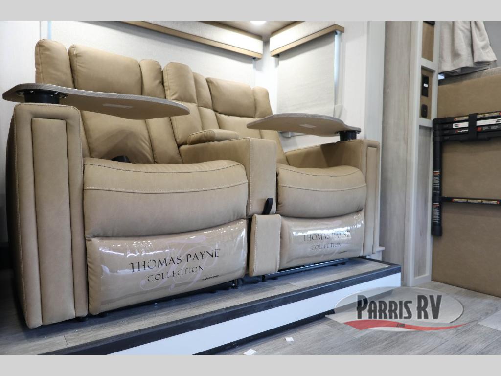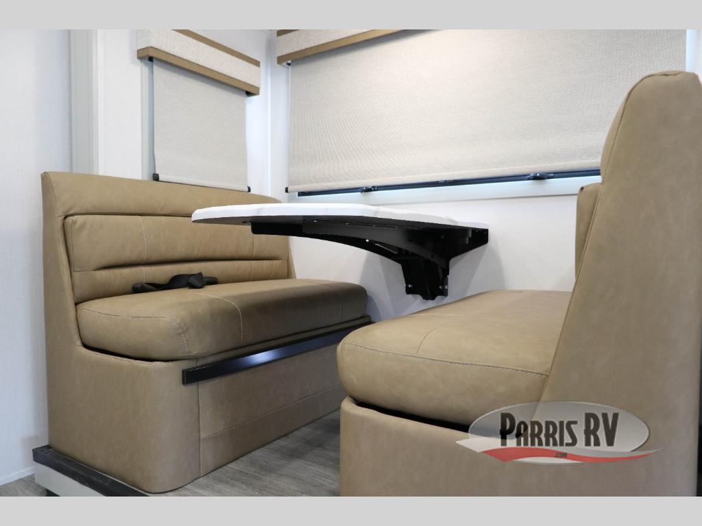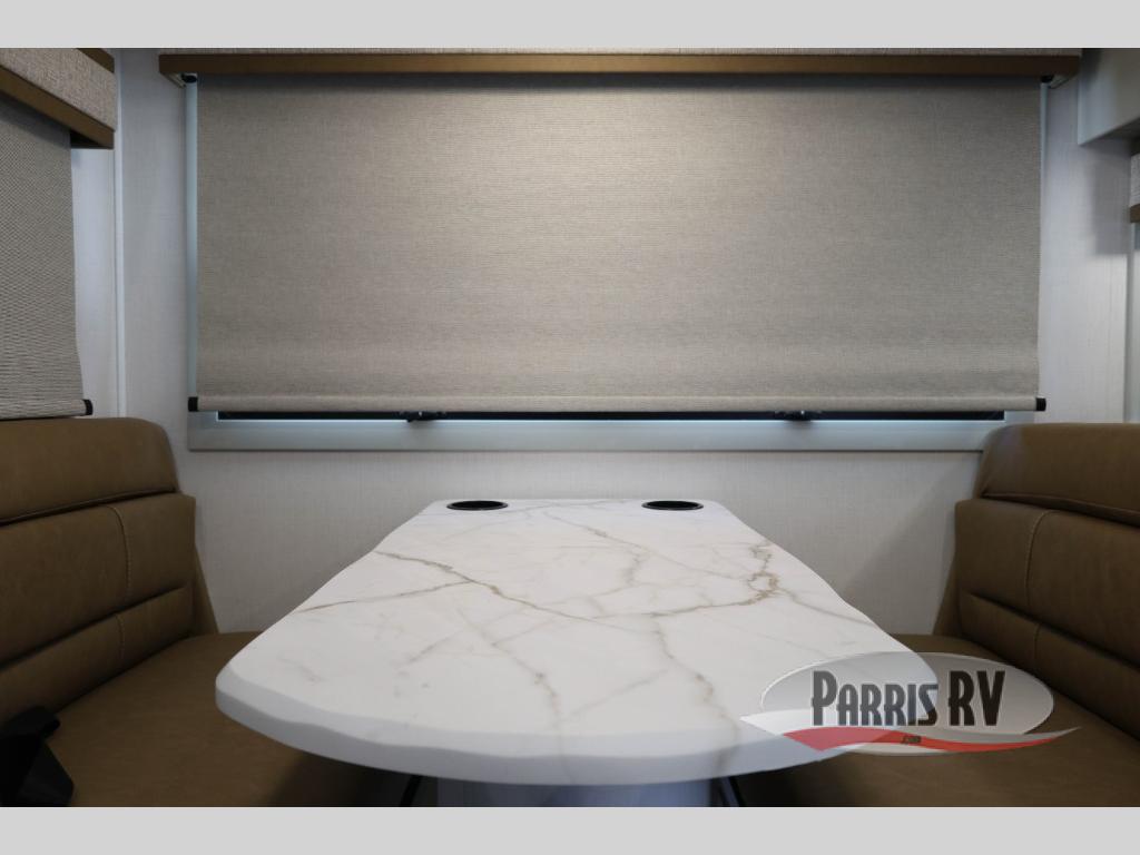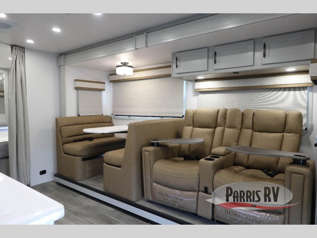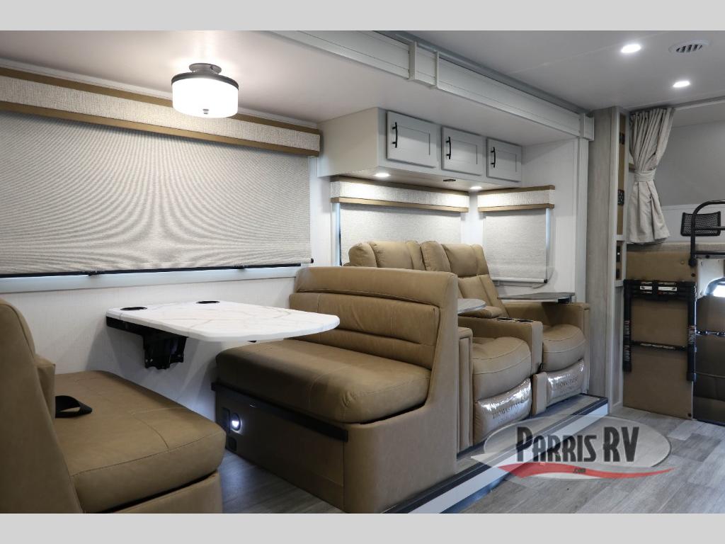 You will have plenty of space to walk about this motorhome with the dual slides! The booth dinette and sofa slide create an open concept living area and the sofa can be replaced for the optional theater seating if you prefer that instead. Freshen up after a long day of traveling in the rear corner bathroom with the designer shower that has a skylight above for more natural lighting and an Oxygenics body spa RV shower head for a more relaxing shower. Put on your comfy clothes stored in the wardrobe in the rear corner private bedroom then either lay on the 60" x 75" gel-infused memory foam mattress while you watch a movie on the 32" LED smart TV or head to the kitchen and whip up a meal with the three burner gas range and countertop extension. You could even head outside and watch a movie on the exterior 32" TV underneath the 16' dual-pitch armless awning!