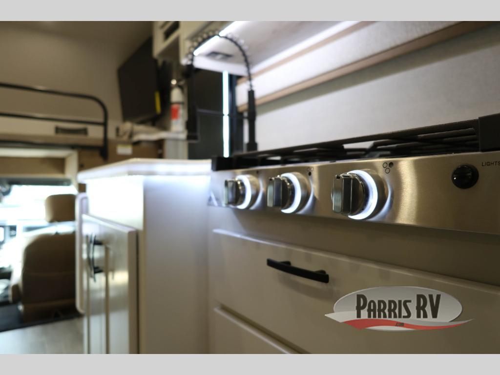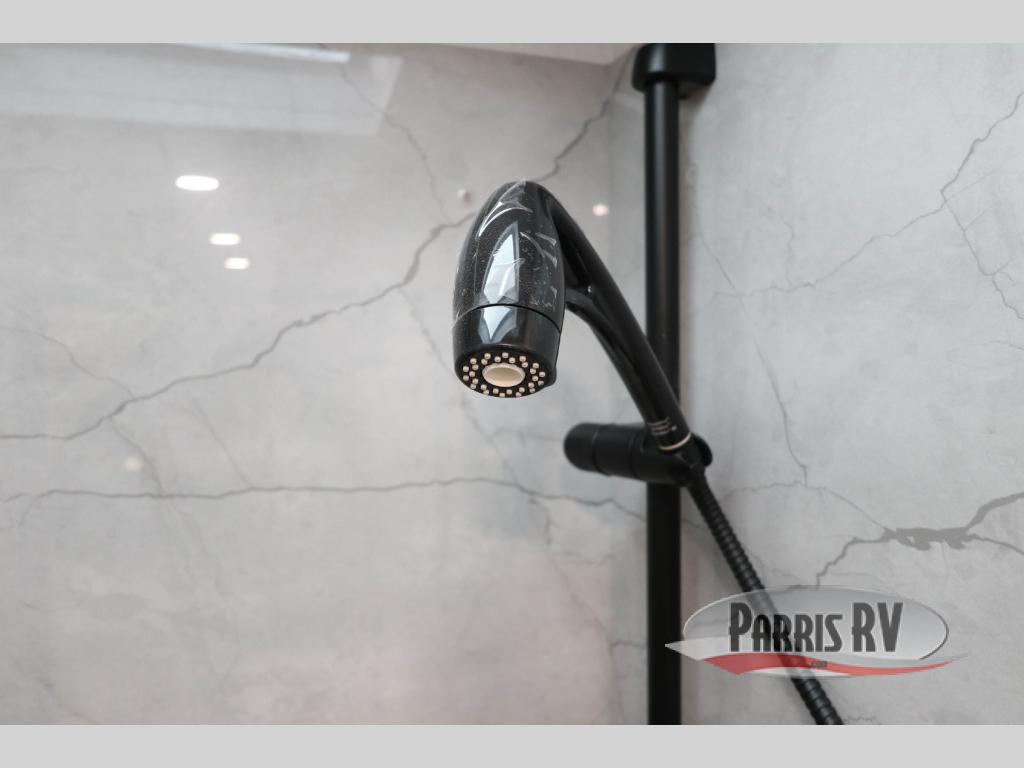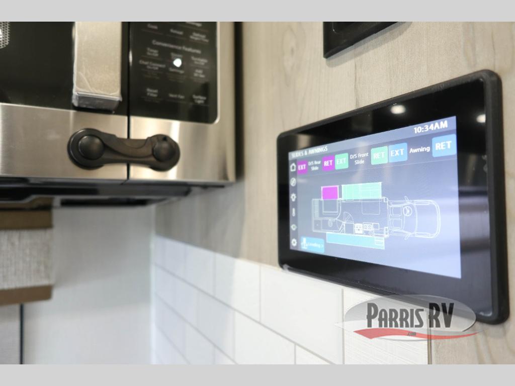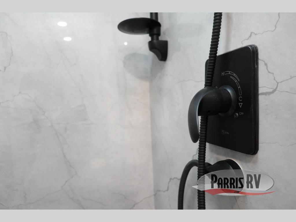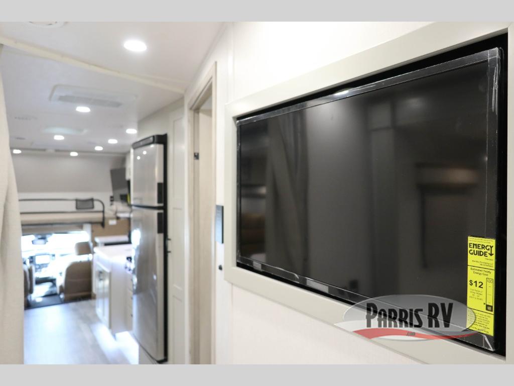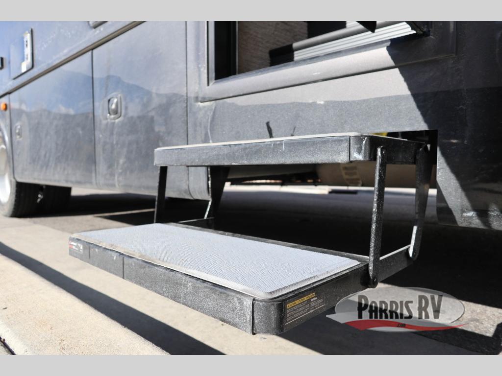 You will have plenty of space to walk about this motorhome with the dual slides! The booth dinette and sofa slide create an open concept living area and the sofa can be replaced for the optional theater seating if you prefer that instead. Freshen up after a long day of traveling in the rear corner bathroom with the designer shower that has a skylight above for more natural lighting and an Oxygenics body spa RV shower head for a more relaxing shower. Put on your comfy clothes stored in the wardrobe in the rear corner private bedroom then either lay on the 60" x 75" gel-infused memory foam mattress while you watch a movie on the 32" LED smart TV or head to the kitchen and whip up a meal with the three burner gas range and countertop extension. You could even head outside and watch a movie on the exterior 32" TV underneath the 16' dual-pitch armless awning!